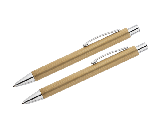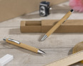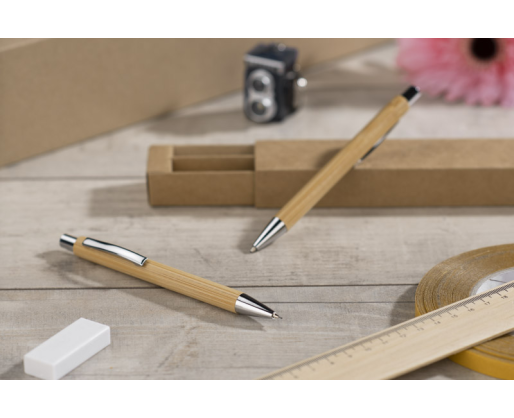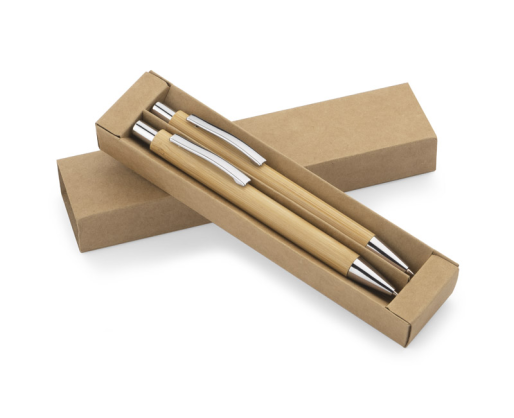 Rinkinys: tušinukas ir automatinis pieštukas MAMBOO BC19664. Supakuota į rudą ekologišką kartoninę dėžutę. Tiek tušinuko, tiek pieštuko korpusas pagamintas iš natūralaus bambuko.