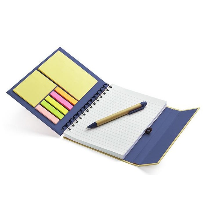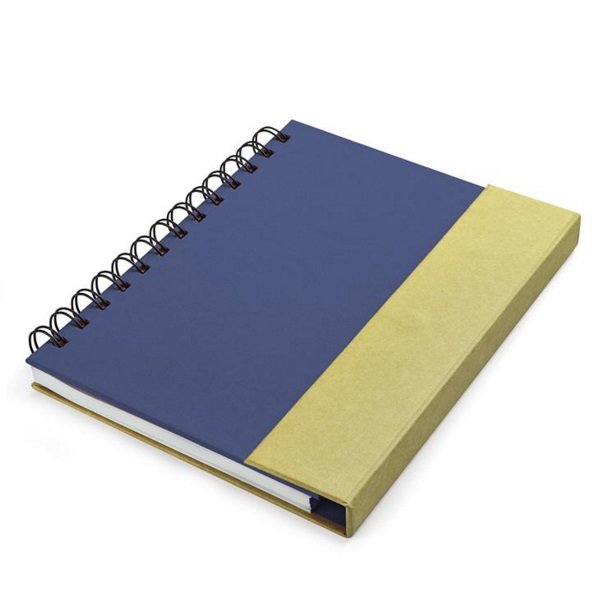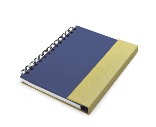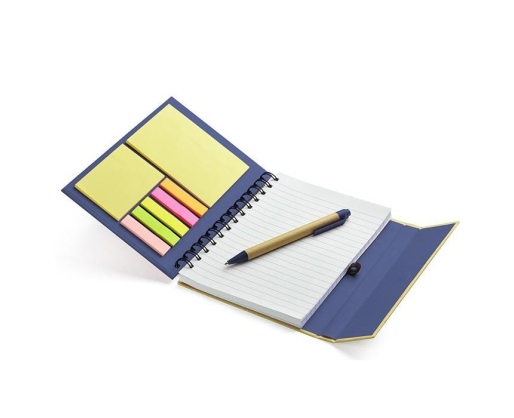Užrašų knygelė su spirale, 70 lapų linijom, viduje yra lipnūs lapeliai, žymekliai ir mėlynai rašantis tušinukas. Tamsiai mėlynos spalvos viršelis. Išmatavimai 149x181x17 mm. Tinka dėti reklaminį užrašą. BC17585-06