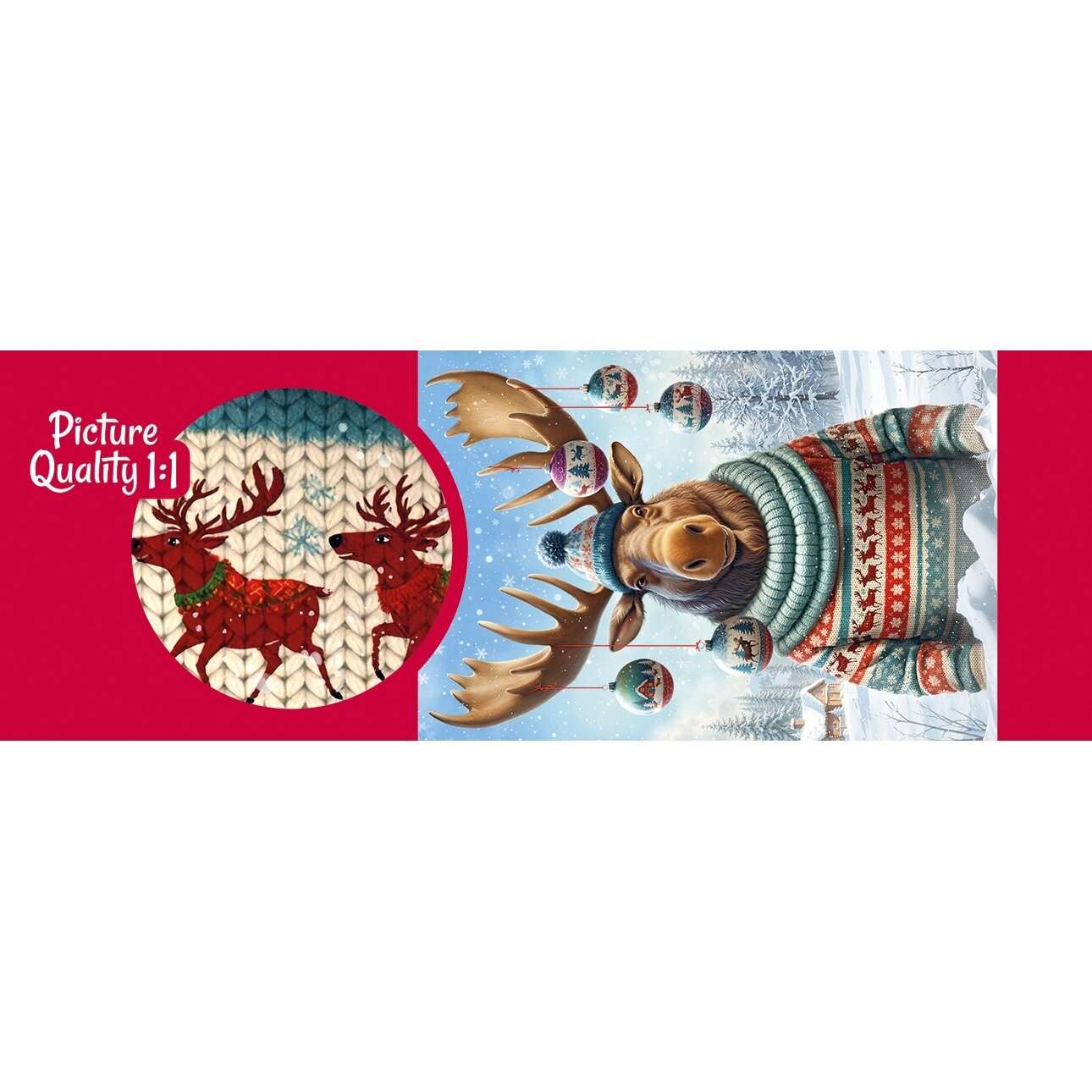 Šis žavus briedis pasiruošęs šventėms! Jis vilki ryškų vilnonį megztinį, užsidėjęs kepurę, o ragus puošia spindintys žaisliukai.