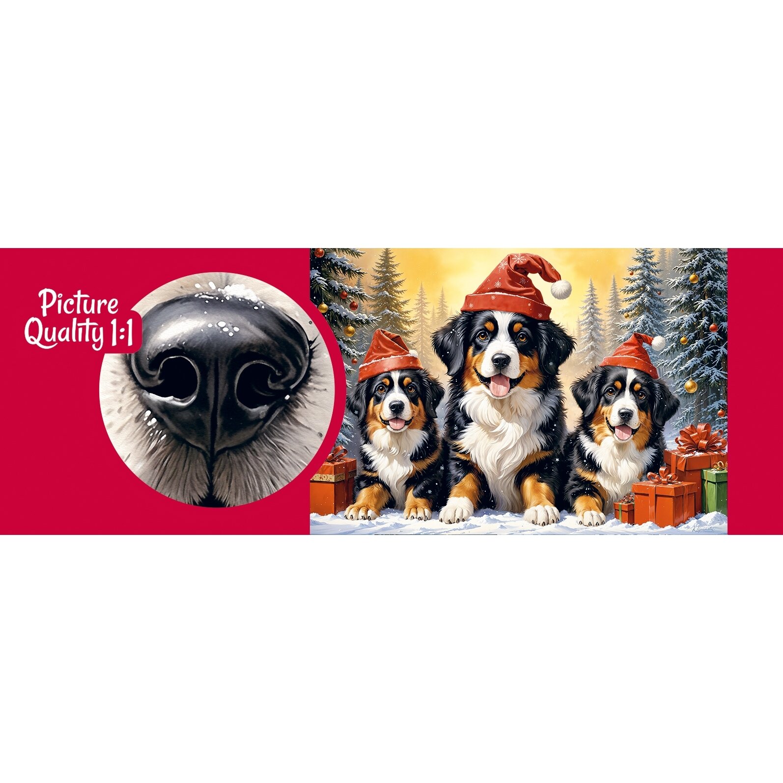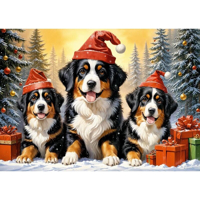 Trys žavingi Berno zenenhundai, papuošti raudonomis Kalėdų Senelio kepurėlėmis, džiaugsmingai pozuoja apsnigtoje žiemos stebuklų šalyje. Jų spindinčios akys ir laimingos šypsenos skleidžia šventinę nuotaiką. Tobula Kalėdų magijos ir pūkuotos draugystės šventė!