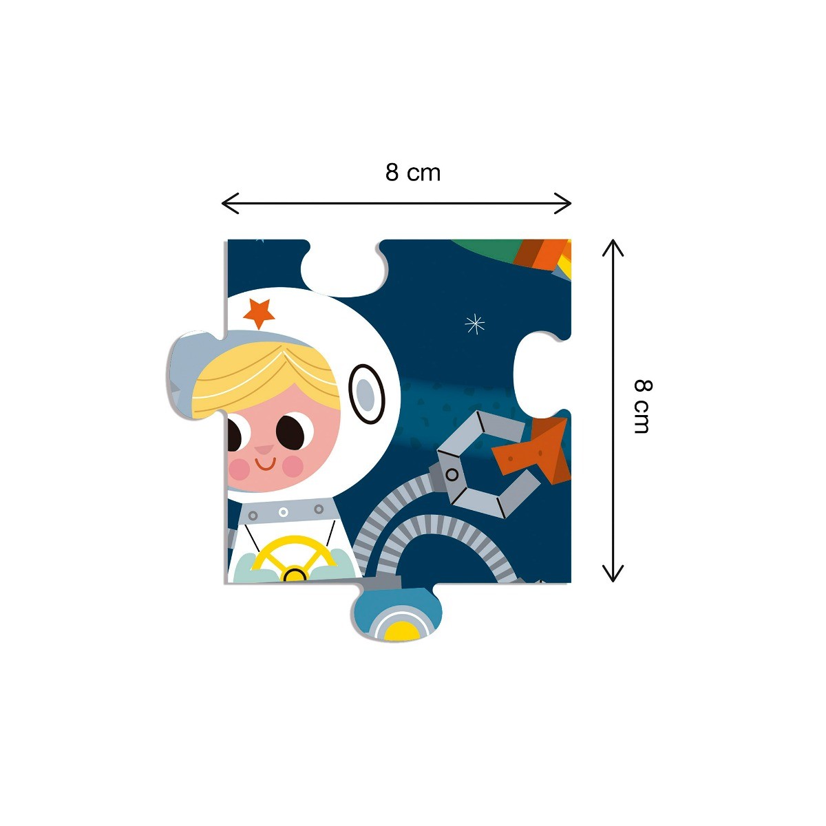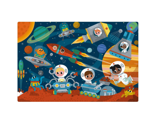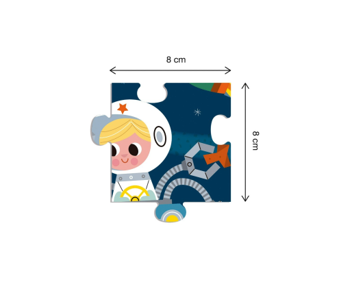 Didelių detalių 8x8 cm dėlionė su spalvingu nuotykiu Kosmose. O kad 24 detalės nepasimestų, jos sudėtos į patogią ir ne ką mažiau smagesnę metalinę dėžutę.