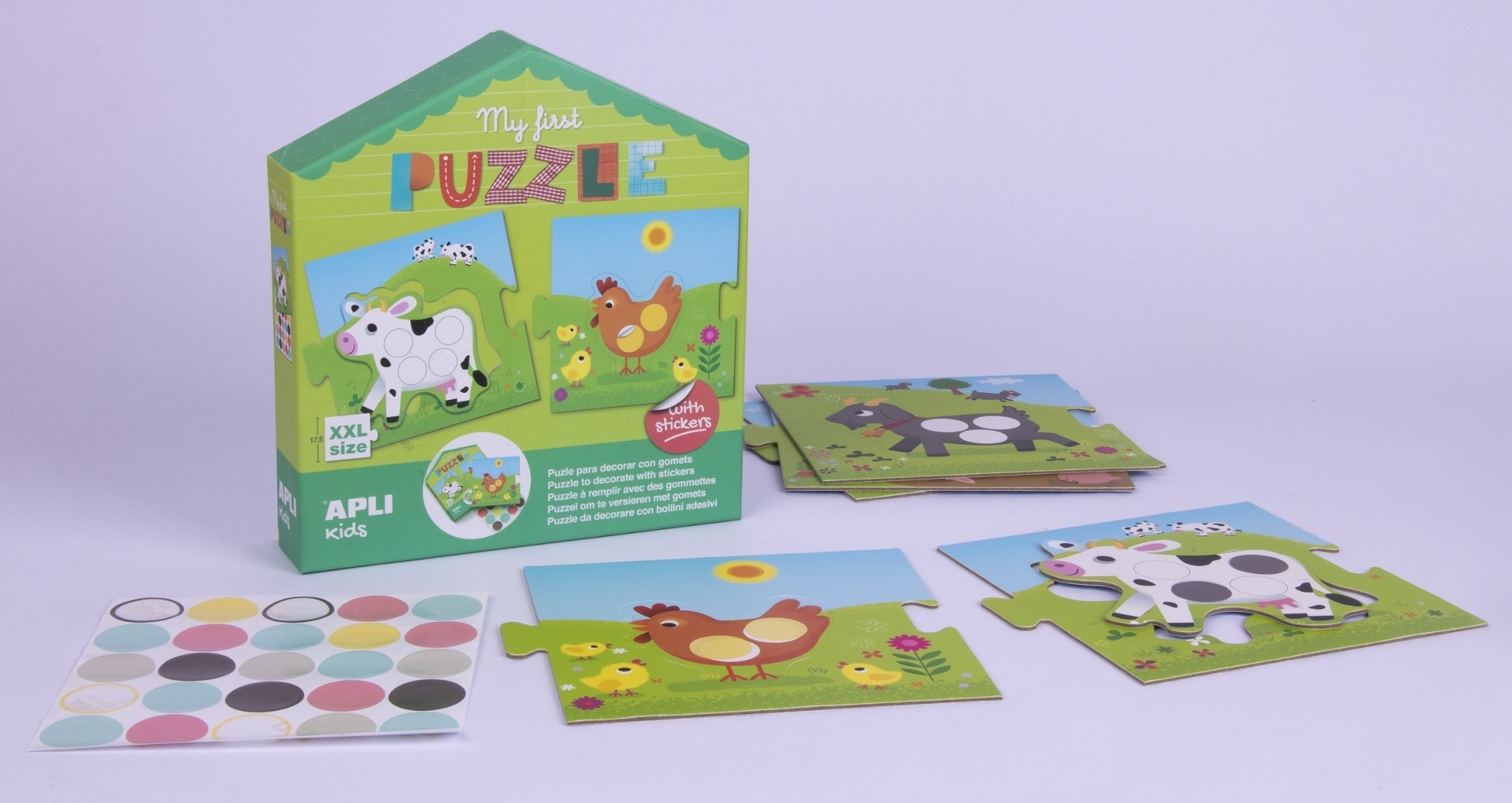 Tai 5 XXL detalių dėlionė su 1 lapu apvalių lipdukų, kuriais galima užpildyti įvairiių gyvūnėlių kontūrus. Taip pat, dėlionės gyvūnėliai yra išimami iš rėmelio, todėl vaikai gali juos taip pat panaudoti kaip trafaretus. Dėl didelių detalių ir saugių medžiagų ši dėlionė yra idealus žaidimas mažiausiems vaikams. Ji padeda mažyliams pagerinti smulkiosios motorikos įgūdžius ir koncentraciją.Viduje: 5 XXL dėlionės detalės su išimamais gyvūnėlių trafaretais, lapas su lipdukais.