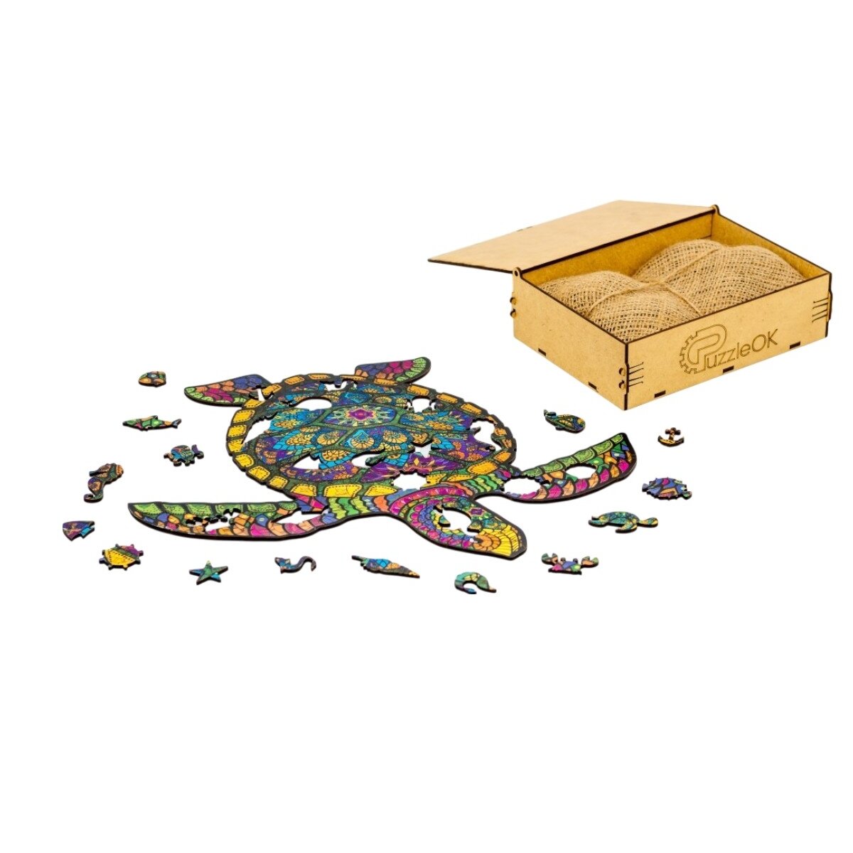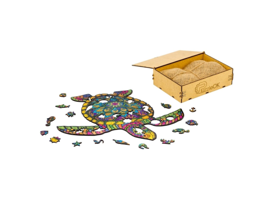 Išskirtinė medinė dėžutė su įvairiaspalvio vėžlio paveikslėliu bus puiki gimtadienio dovana jūsų vaikui, jums ar jūsų draugams. Netikėta staigmena visada įdomi. Viduje lininiame ritinėlyje kruopščiai supakuota 50 keistų formų įvairiaspalvių elementų, iš kurių reikia padaryti tikslią dangtelio viršuje esančio paveikslėlio kopiją.