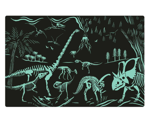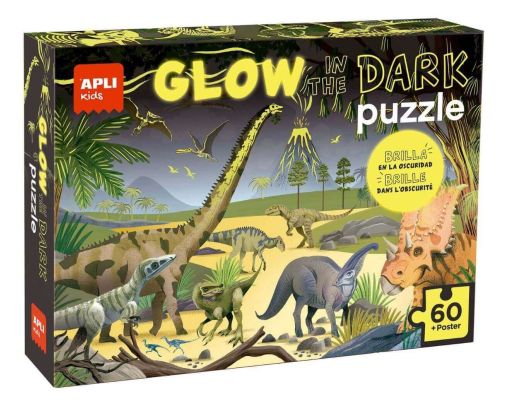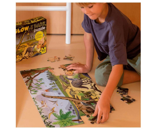 Leisk vaikui nerti į paslaptingą dinozaurų pasaulį su šia ypatinga tamsoje šviečiančia dėlione! Surink dėlionę iš 60 tvirtų detalių ir, kai paveikslas bus baigtas, išjunk šviesą – atgis švytintys dinozaurai ir paslaptingos detalės, kurios matomos tik tamsoje!