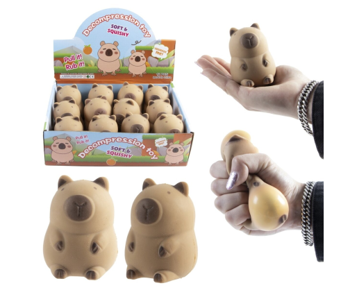 Mielas ir itin švelnus *squeeze* tipo kapibara žaislas, puikiai tinkantis stresui malšinti, rankoms mankštinti ar tiesiog žaismingai nuotaikai pakelti. Pagamintas iš minkštos, tamprios medžiagos ir pripildytas pudros, todėl maloniai gniaužosi ir grįžta į pradinę formą.