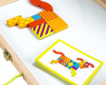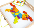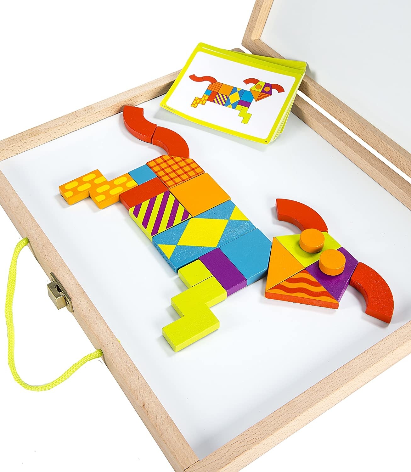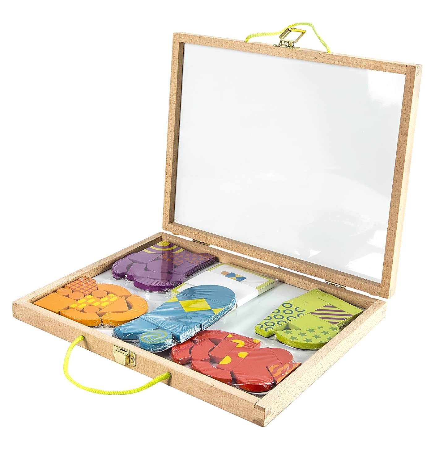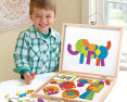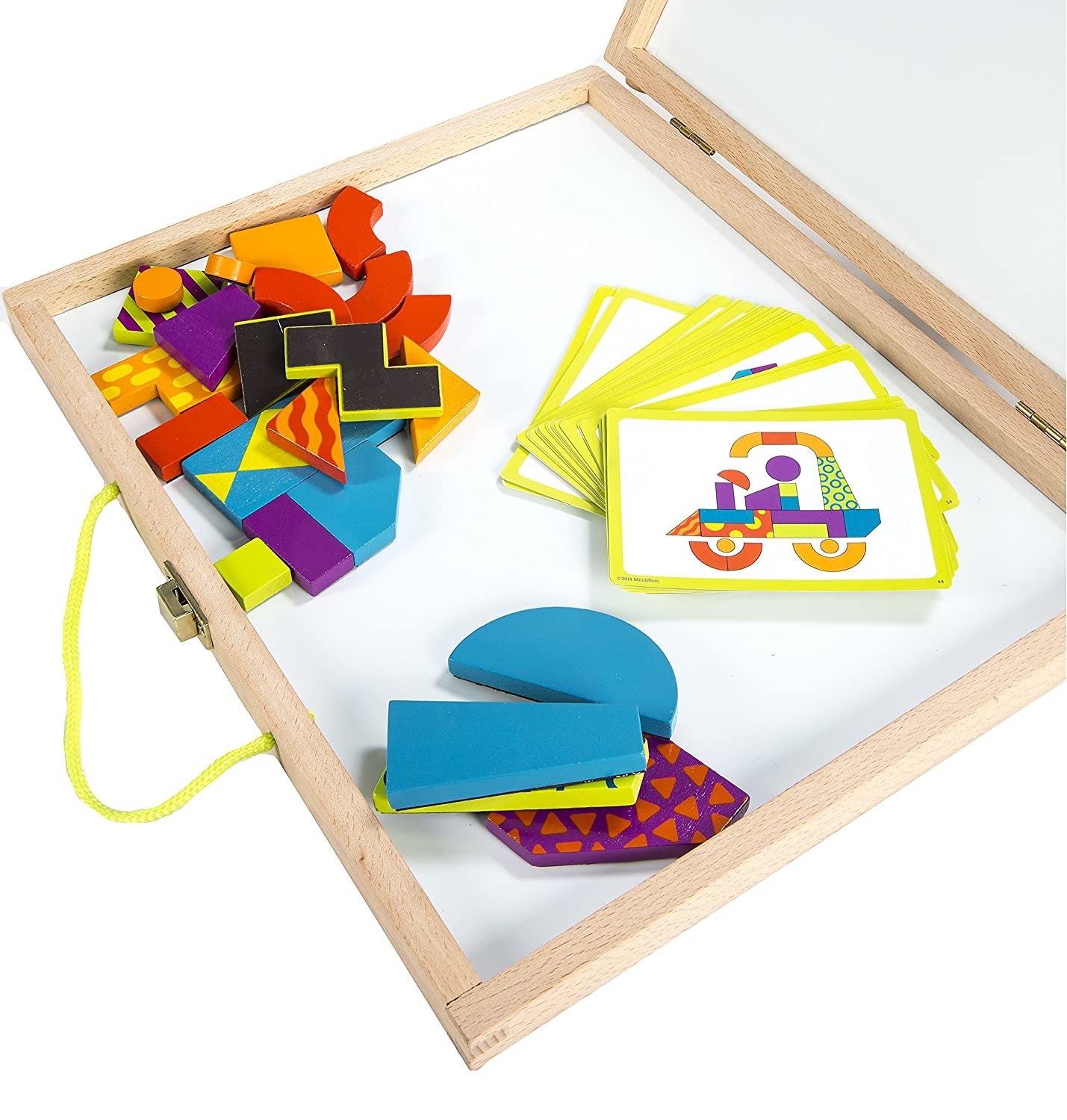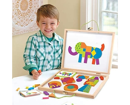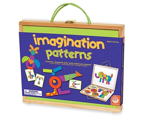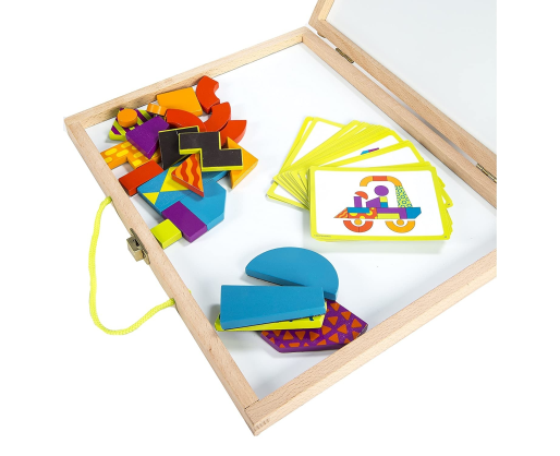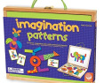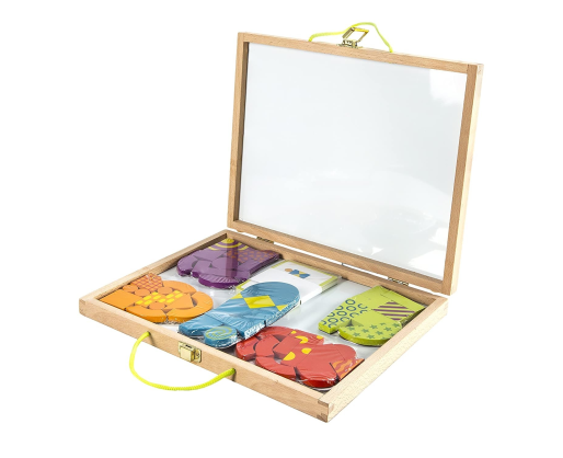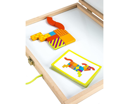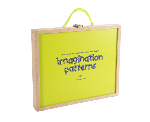Kviečiami visi dėlionių ir raštų mylėtojai! „Imagination Patterns” rinkinio detalės papuoštos smagiais langeliais, brūkšneliais ir taškeliais! Metas sustiprinti vaikų smulkiosios motorikos ir vizualinio mąstymo įgūdžius su šiuo strateginiu statymo įrankiu! Imagination Patterns rinkinyje yra tvirtas medinis nešiojimosi ir laikymo dėklas su patvariais vyriais ir virvinėmis rankenomis. Šio dėklo viduje ryškiaspalviai mediniai magnetiniai blokeliai gali būti sudėliojami atkartojant bet kurį iš 50 spalvingų galvosūkių, tokių kaip gyvūnai, veidai, transporto priemonės, gėlės, struktūros ir kita! Beje, magnetinis kūrybinis paviršius taip pat gali būti panaudojamas kaip nuvaloma piešimo lenta. Spalvingos raštų kortelės sunumeruotos pagal sudėtingumą, nuo pradinuko iki eksperto lygio. Kiekvienam iššūkiui vis sudėtingėjant, bandydami, klysdami ir vėl bandydami, vaikai ugdo kantrybę ir pasitikėjimą savimi. Įveikę visus iššūkius, vaikai gali pasinaudoti kūrybiškumu ir sukurti savo unikalius projektus. Imagination Patterns įkvepia valandų valandas trunkantiems žaidimams ir greitai tampa namų favoritu. Moko spalvų, formų pažinimo, skaičiavimo bei lavina smulkiosios motorikos įgūdžius.
