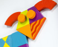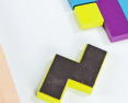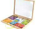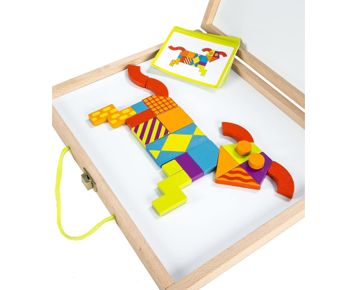 Viduje: 42 ryškiaspalviai mediniai magnetiniai blokeliai, medinis lagaminėlis, 50 spalvingų iššūkių kortelių.