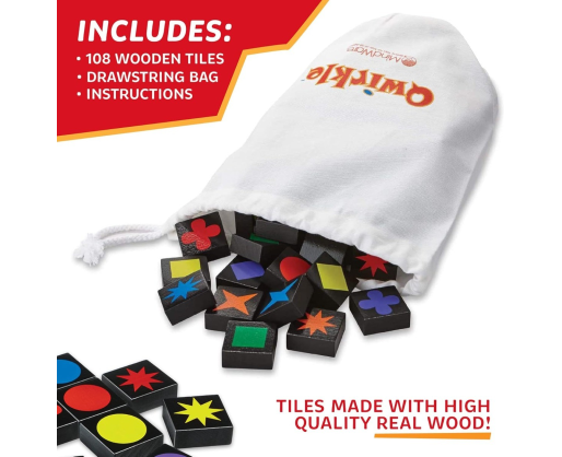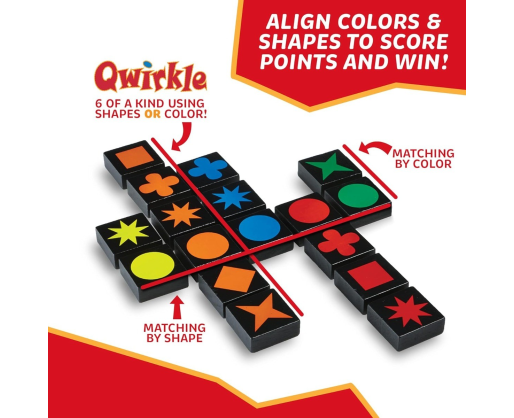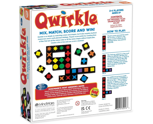 Žaisti Qwirkle yra pakankamai paprasta - tereikia jungti vienodas spalvas ir formas, tačiau iš tiesų šis žaidimas reikalauja daug daugiau - jums prireiks gerai suplanuotos strategijos ir taktinių manevrų. Rinkite taškus, statydami eilutes ir stulpelius iš kaladėlių turinčių tokią pačią formą ar spalvą. Ieškokite būdų kaip gauti kuo daugiau taškų padėdami kaladėlę, kuri iš karto liestųsi su daugiau nei viena kaladėle, turinčia tas pačias formas ar spalvą. Žaidėjas surinkęs daugiausiai taškų laimi!Viduje: Rinkinyje yra 108 medinės kortelės.