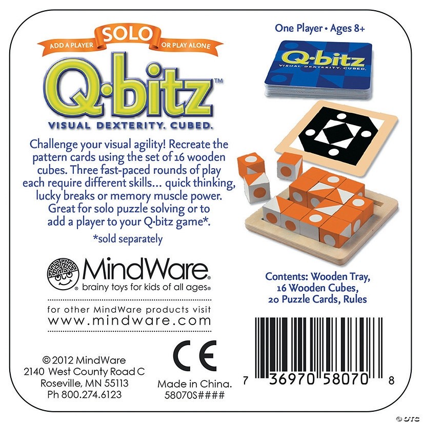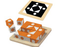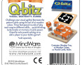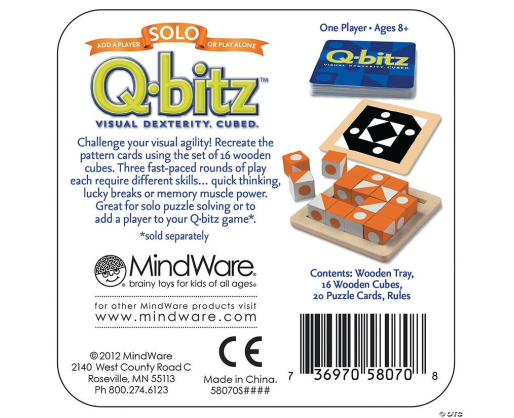 Viduje: 20 Q-Bitz kortelės, 1 medinis padėklas ir 16 kubelių, instrukcija (EN)