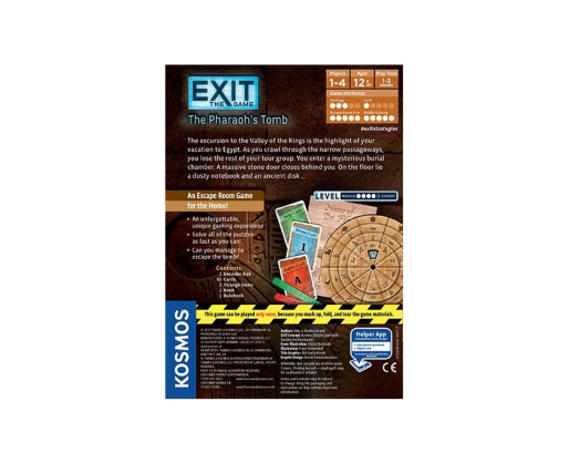 Ekskursija į Karalių slėnį yra Jūsų atostogų į Egiptą akcentas. Kai Jūs praeisite per siaurus praėjimus, prarasite likusią kelionių grupės narių dalį. Įeisite į paslaptingą laidojimo kamerą. Už Jūsų užsidarys masyvios akmeninės durys. Ant grindų guli dulkėtas nešiojamasis kompiuteris ir senovinis diskas ... Ar galite išspręsti senovės piramidės tyrinėtojo paliktas mįsles ir pabėgti iš kapo? "EXIT" galvosūkiai puikiai suderina logiką ir kritinį mąstymą.Viduje: 1 dekodavimo, 83 kortelės, 2 "keisti" objektai, 1 knygelė, 1 taisyklių knygelė anglų kalba (EN).