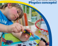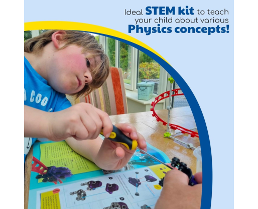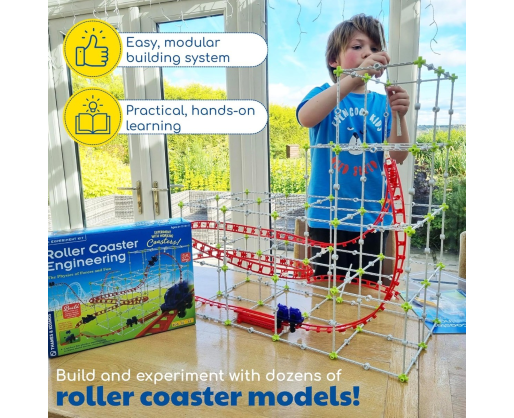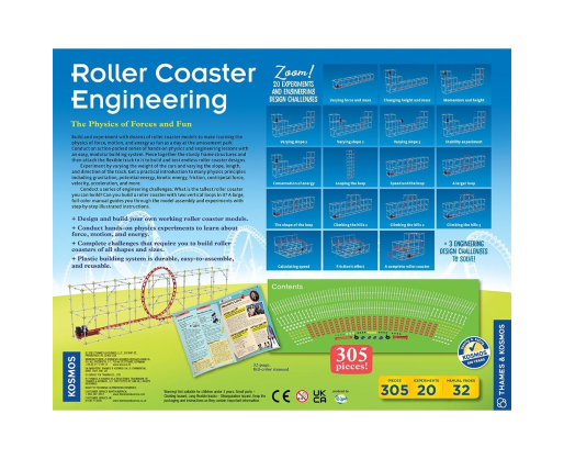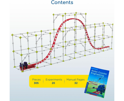Fizikos ir inžinerijos pažinimas gali būti toks pats smagus, kaip diena atrakcionų parke! Kurdami skirtingus amerikietiškų kalnelių modelius susipažinsite su inžineriniais principais bei klasikine mechanika (jėga, judesys ir energija). Jungsite tvirtas rėmo konstrukcijas, tvirtinsite prie jų takelius ir tada te prasideda eksperimentai - keiskite automobilių svorį, trasos nuolydį, ilgį ir kryptį. Per praktiką susipažinkite su daugeliu fizikos principų: gravitacija, potencine energija, kinetine energija, laisvu kritimu, įcentrine jėga, pagreičiu. Jūsų taip laukia įvairūs inžineriniai iššūkiai: kokį aukščiausią amerikietišką kalnelį galite pastatyti? O ilgiausią? O gal galite pastatyti kilpą? Taigi, pirmyn į pažinimų parką!Viduje: 305 detalės, 32 puslapių spalvingas vadovas (anglų kalba).
