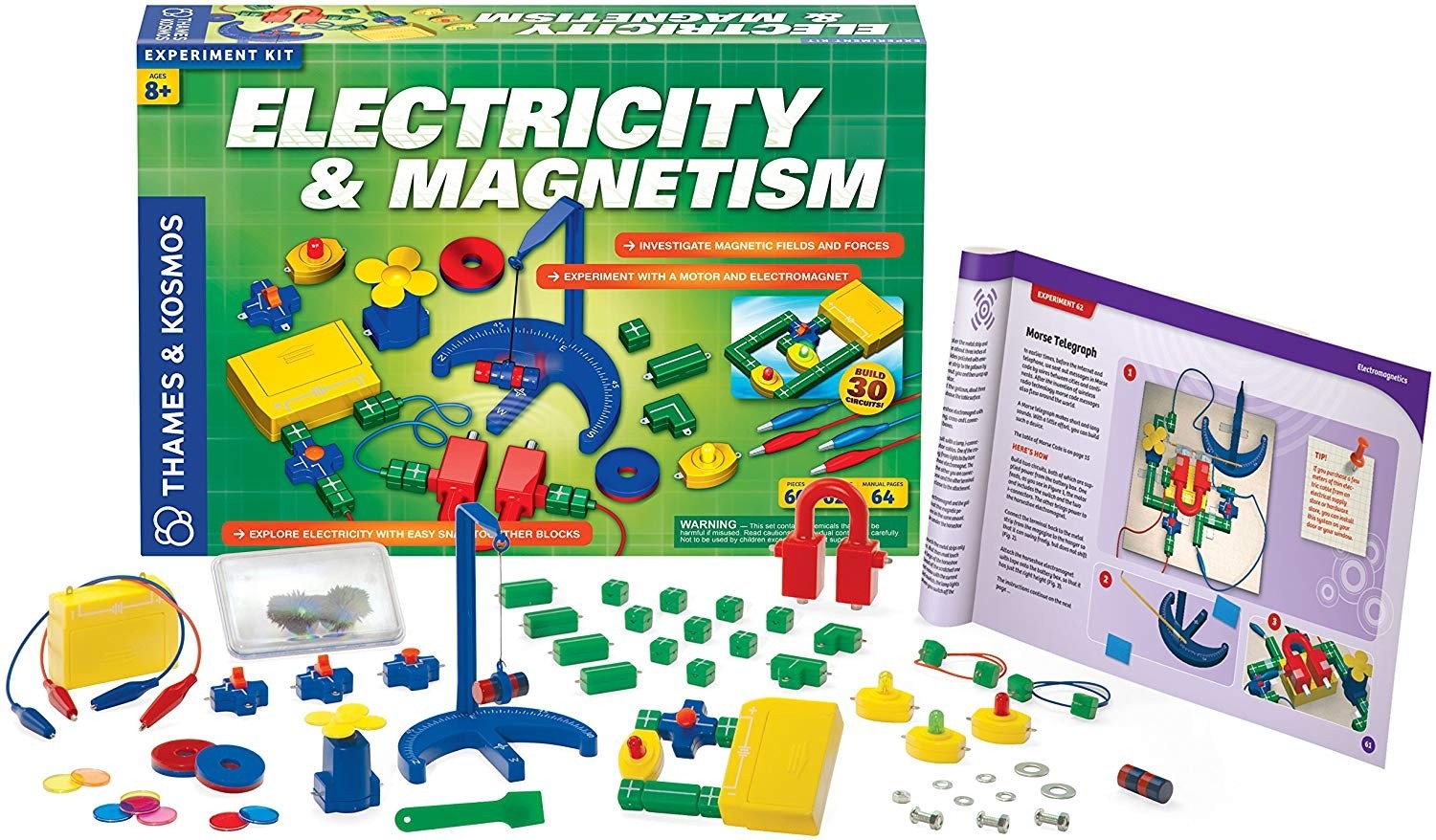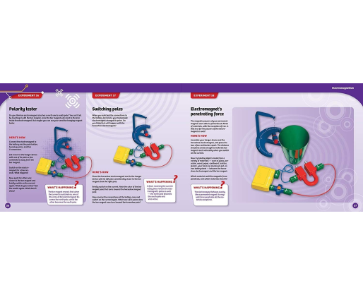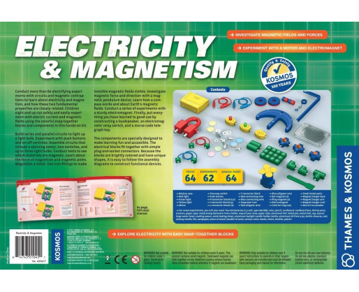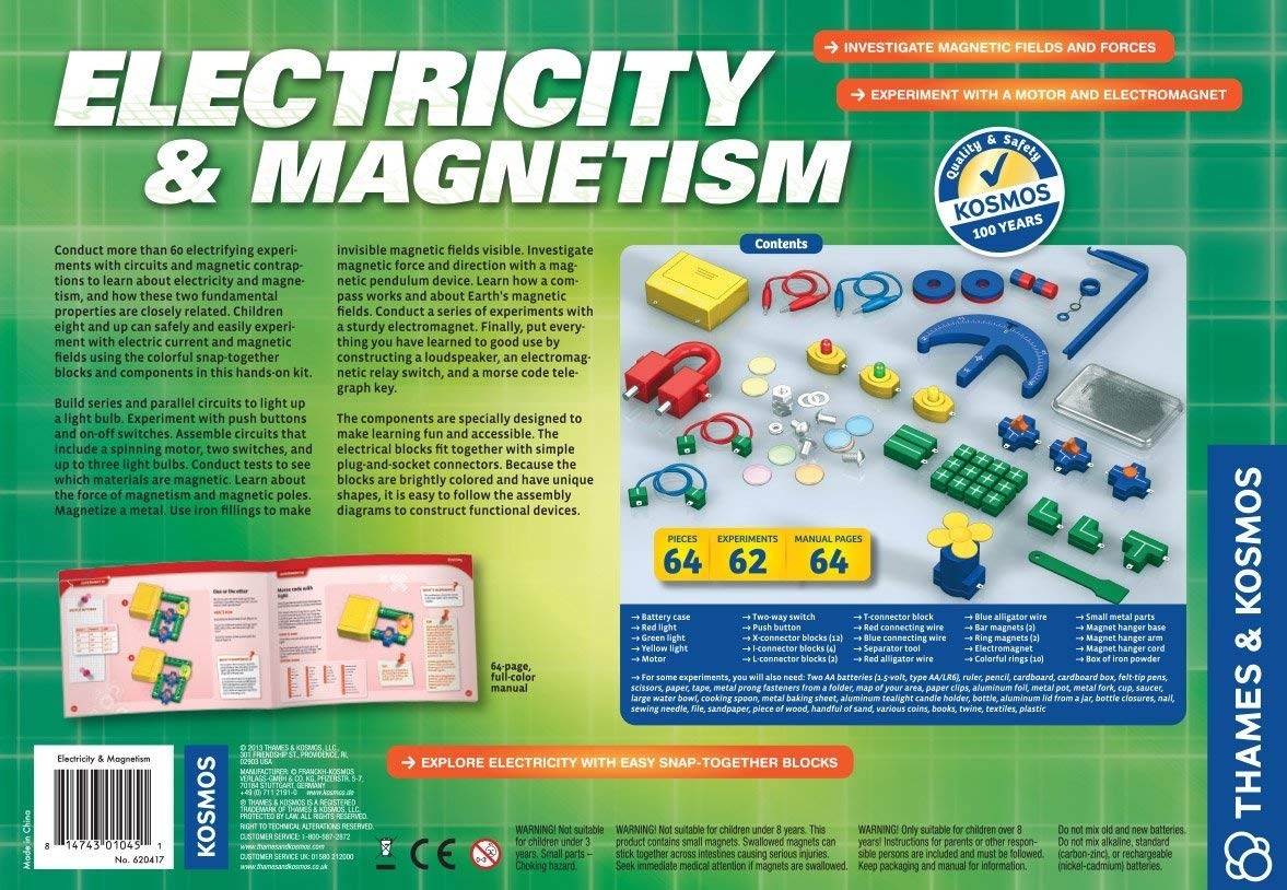 Norėdami sužinoti apie elektrą ir magnetizmą bei tai, kaip šios dvi sritys yra susijusios, atlikite daugiau nei 60 eksperimentų su grandinėmis ir magnetinėmis kontrakcijomis. Aštuonerių metų ir vyresni vaikai galės saugiai ir lengvai eksperimentuoti su elektros srove ir magnetiniais laukais, naudodamiesi spalvotais prisegamais blokeliais ir kitais komponentais, esančiais šiame praktiškame komplekte. Atlikite bandymus, kad pamatytumėte, kurios medžiagos yra magnetinės. Sužinokite apie magnetizmo jėgą ir magnetinius polius. Galiausiai gerai panaudokite viską, ką išmokote, pastatydami garsiakalbį, elektromagnetinės relės jungiklį ir Morzės kodo telegrafo raktą. Komponentai yra specialiai sukurti tam, kad mokymasis būtų įdomus ir prieinamas kiekvienam vaikui.Viduje: 64 detalės, padėsiančios atlikti daugiau nei 60 eksperimentų ir sukurti įvairių elektros ir magnetų veiklą pažinti leidžiančių priemonių bei 64 puslapių iliustruotas instrukcijų gidas (EN)