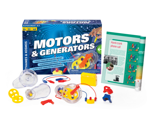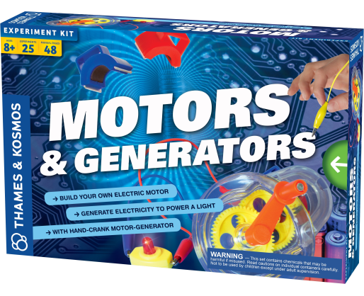 Nesuskaičiuojama daugybė įrenginių, prietaisų ir transporto priemonių kasdien naudoja įvairiausius elektrinius variklius ir generatorius. Jie yra esminė technologija mūsų moderniame pasaulyje. Naudodamiesi šiuo rinkiniu, galite atlikti 25 eksperimentus ir išmokti, kaip elektrinis motoras elektrą paverčia judėjimu ir kaip elektros generatorius padaro priešingą veiksmą - paverčia judėjimą elektra. Elektrinis variklis sukurtas iš skaidraus plastiko tam, kad galėtumėte stebėti, kaip veikia viduje esantys komponentai. Nustatykite variklį veikti naudojant baterijos teikiamą energiją ir supraskite, kaip ja naudodamasis variklis veikia. Tuomet perkonfigūruokite prietaisą dirbti priešingu būdu kaip rankena valdomam elektros generatoriui. Eksperimentuokite su magnetais norėdami suprasti magnetizmo galią ir kaip magnetiniai laukai yra susiję su elektros srove. Pastatykite paprastas grandines, sudarytas iš variklio arba generatoriaus, laidų ir elektros lemputės bei supraskite elektros tekėjimo principus. Sužinokite daugiau apie dantračius ir pavaras ir tai, kaip jie veikia tam, jog galėtų efektyviai konvertuoti kinetinę energiją į elektros energiją ir atvirkščiai. Spalvotas, 48 puslapių vadovas pateikia išsamias, eksperimentus atlikti padedančias instrukcijas.Viduje: 25 eksperimentai ir jiems atlikti reikalingos detalės (2 magnetai, baterijų dėžutė, plastikinė rankena, raudona LED lemputė, 2 jungiamieji laidai su prisegamais krokodilais), 48 puslapių instrukcijų vadovas (EN).