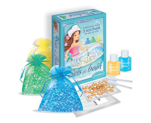 Šis mažas kūrybinis kosmetikos rinkinys leis Jums sukurti savo unikalias jūros druskas ir mėgautis atpalaiduojančiomis ir kvapniomis akimirkomis vonioje. Tam, jog galėtumėte sukurti savo vonios druskas, šis “pasidaryk pats” kosmetikos rinkinys siūlo paprastą receptą: sumaišykite kvapus, algae ekstraktus, įvairiaspalves žvaigždutes ir rupią druską bei suberkite viską į gražų organzos maišelį. Tai - tobula dovana, kuri ne tik įkvėps kūrybiniams procesui, bet ir suteiks galimybę išbandyti savo kūrinį atsipalaiduojant karštoje vonioje. Saugūs ingredientai ir formulės Šis “pasidaryk pats” rinkinys buvo patikrintas pagal “Žaislų ir kosmetikos” reglamentus prižiūrint dermatologų. Visi ingredientai ir formulės yra netoksiški bei visiškai saugūs vaikų odai.Viduje: 200g rupios druskos, 1 mėlynas kvapnus kosmetinis kolorantas, 1 geltonas kvapnus kosmetinis kolorantas, 2 pipetės, 3 organzos maišeliai, 1 maišelis žvaigždučių, instrukcijos.