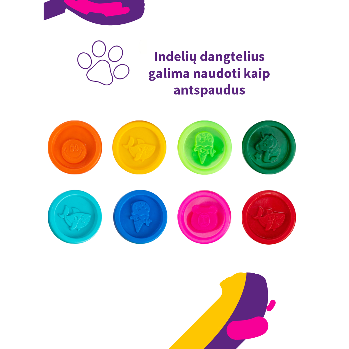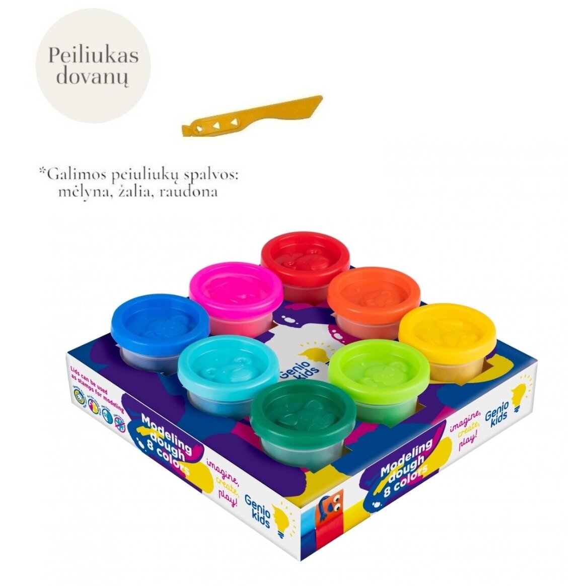 Puikus lipdymo rinkinys, skirtas lavinti vaiko kūrybinius įgūdžius, vaizduotę, rankų judesius, mąstymą. Su 8 skirtingų spalvų lipdymo tešlos gabaliukais pasitelkiąs fantaziją Jūsų vaikas galės kurti ką tik panorės. Lipdymo tešla - tai unikalus produktas, padėsiantis lavinti Jūsų vaiko kūrybiškumą. Ji nelimpa prie rankų, yra minkšta ir plastiška. Lipdymo tešla pagaminta iš nekenksmingų ir natūralių medžiagų.