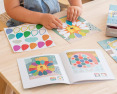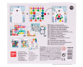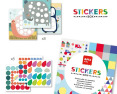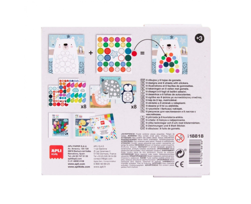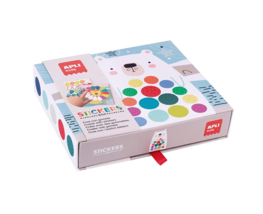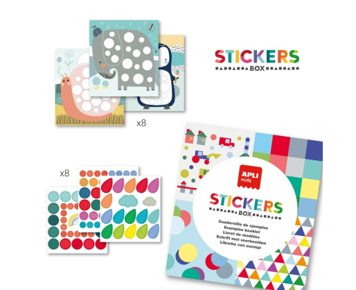 Viduje: 8 lakštai, skirti klijuoti lipdukus, 8 skirtingų spalvų nuimamų geometrinių lipdukų lapai ir spalvota knygutė su pavyzdžiais.