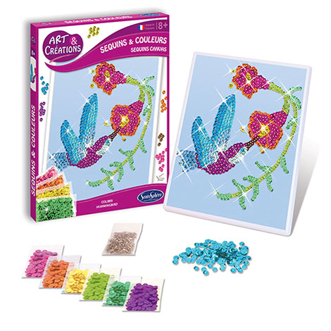 Šie kolibriai sublizgės tūkstančiu spalvų dėka 6 spalvų blizgučių, kuriuos rasite šioje stebuklingoje dėžutėje. Galėsi pagaminti spinduliuojančius ir įvairiaspalvius paveiksliukus iš daugybės blizgučių, kuriuos reikia pritvirtinti su smeigtukais prie specialios kartoninės lentutės. Tai ypatingai smagi ir kūrybinga veikla kurianti daug blizgesio ir džiugesioViduje: • 1 kartoninė lentutė • 1 rėmas • 8 maišeliai blizgučių • 1 maišelis smeigtukų • 1 paaiškinimų lapas