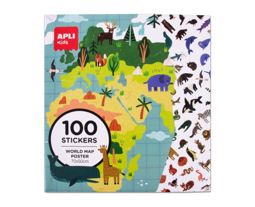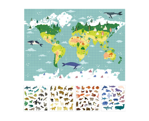 Didelis plakatas su daugkartiniais lipdukais vaizduoja viso pasaulio žemynus. Užpildykite plakatą smagiais daugkartiniais lipdukais ir užpildykite žemynus gyvybe! Žaidimas su lipdukais yra pagrindinė veikla, leidžianti vaikams lavinti smulkiuosius motorinius įgūdžius ir įvairius pažintinius gebėjimus. Plakate vaizduojami objektai, augalai ir gyvūnai skatina spalvų pažinimą, pildo vaiko žodžių žodyną, supažindina su pasauliu ir jame gyvenančiais gyvūnais bei skatina žaisti vaidmenų žaidimus, ugdo kūrybingumą. Pildydami plakatą kartu su draugais, vaikai mokosi bendrauti bei palaukti savo eilės taip lavindami socialinius įgūdžius.