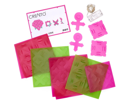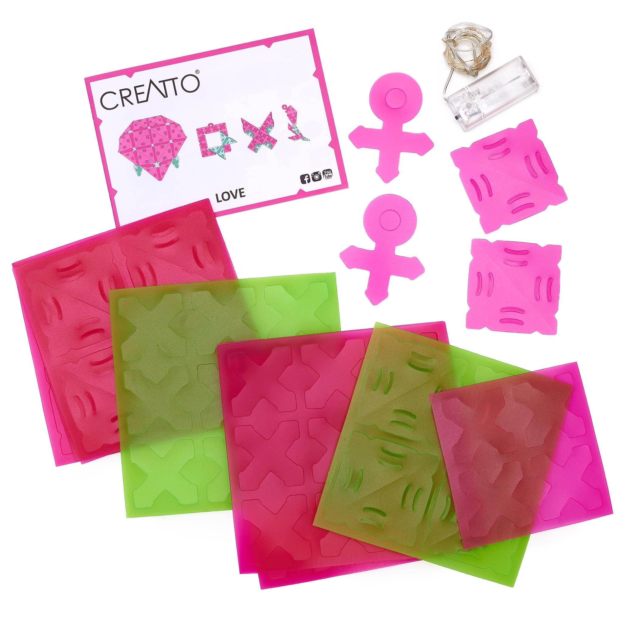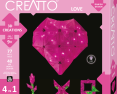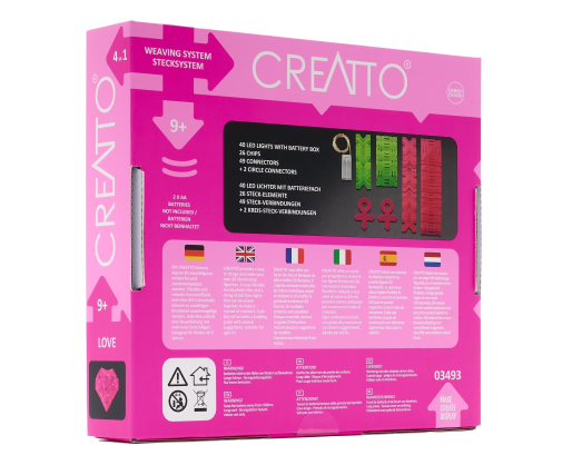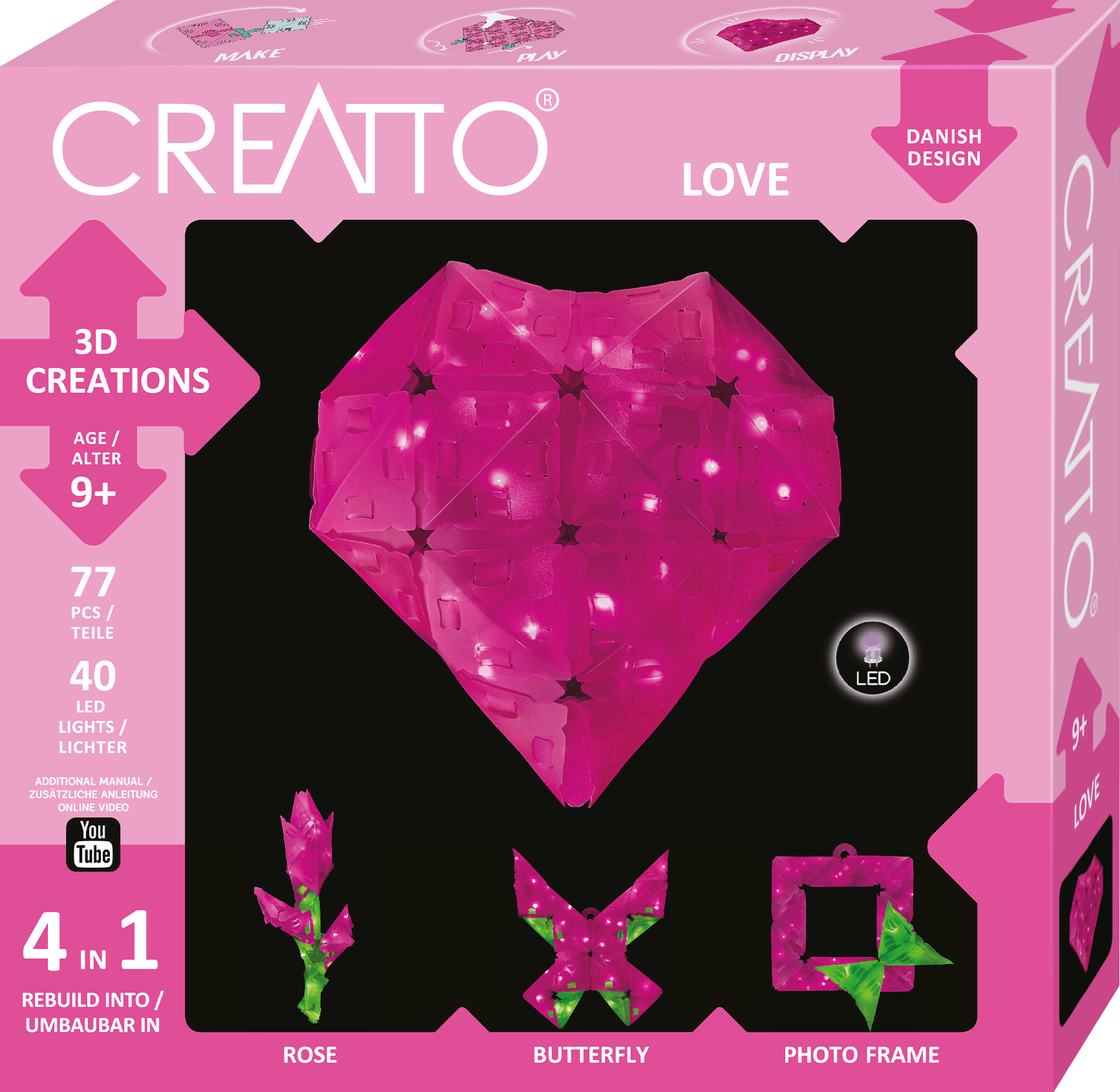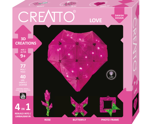 Creatto yra paprasta, tačiau įvairiapusė statymo sistema, sudaryta iš vos dviejų pagrindinių komponentų, kurie gali būti sujungti vienas su kitu į nesuskaičiuojamą daugybę 3D kūrinių. Patvarios ir lanksčios plastikinės dalys susijungia greitai ir paprastai, todėl tinka tiek mažiau, tiek daugiau įgudusiems statytojams, o geriausia tai, jog nereikia jokių papildomų detalių ar technikos! Kiekviename Creatto rinkinyje yra vizualios, išsamios instrukcijos, pagal kurias galite sukurti keturias skirtingas konfigūracijas, tačiau galimybes apriboja tik Jūsų vaizduotė, tad pasitelkę ją galėsite sukurti galybę skirtingų kūrinių. Baigę statyti panaudokite savo kūrinį žaisdami pačiais įvairiausiais būdais ir leiskitės į galybę nuotykių ir istorijų. Jūsų pastatytas personažas yra ne tik žaislas, tačiau ir meno kūrinys. Pademonstruokite jį savo kambaryje ir leiskite visiems pamatyti Jūsų kūrybiškumą ir individualumą! O pritaisę LED lemputes sukursite itin pribloškiantį reginį.Viduje: 77 Creatto detalės, 40 LED lempučių girlianda, instrukcija (EN), kaip pastatyti didelę širdelę, gėlę, drugelį, rėmelį ir kitus, savo vaizduotės kūrinius. Girlianda veikia naudojant 2 AA tipo elementus (elementai prie rinkinio nepridedami).