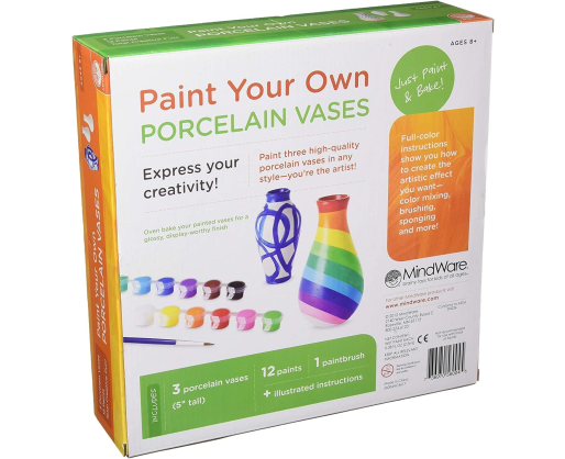 Papuoškite namus nuostabiomis gėlėmis ir pasidžiaukite savo artistiniais gebėjimais vienu metu su Paint Your Own Porcelain Vases! Sukurkite savo unikalias vazas, tuomet „iškepkite” jas orkaitėje taip išgaudami blizgius ir išbaigtus meno kūrinius su šiuo aukštos kokybės kūrybiniu rinkiniu. Spalvotos ir lengvai suprantamos instrukcijos supažindina su dažymo technikomis ir leidžia sukurti Jūsų norimus artistiškus efektus - maišytas spalvas, potėpius teptuku arba kempine ir kitus. Paint Your Own Porcelain rinkinyje yra trys balto porceliano vazos, suteikiančios galimybę pasireikšti Jūsų kūrybiškumui ir panaudoti kiekvieną jų skirtingai! Sukurkite savo unikalias popierines gėles, kurias galėsite laikyti vazose ir džiaugtis ištisus metus arba pamerkite ką tik nuskintas gėles iš sodo. Vazas galite panaudoti kaip dekoratyvinius elementus savo namuose arba padovanoti jas šeimai, draugams, mokytojams kaip prasmingą, personalizuotą dovaną. Tapymas yra labai naudingas, kadangi įdarbina abu smegenų pusrutulius, o tuo pačiu leidžia pasinerti į atpalaiduojančią, džiaugsmo suteikiančią kūrybinę veiklą. Stiprina kūrybingumą, akių-rankų koordinaciją, kantrybę, smulkiosios motorikos ir dizaino įgūdžius. Puikiai tinka švenčiant gimtadienius ar kitas specialias progas.