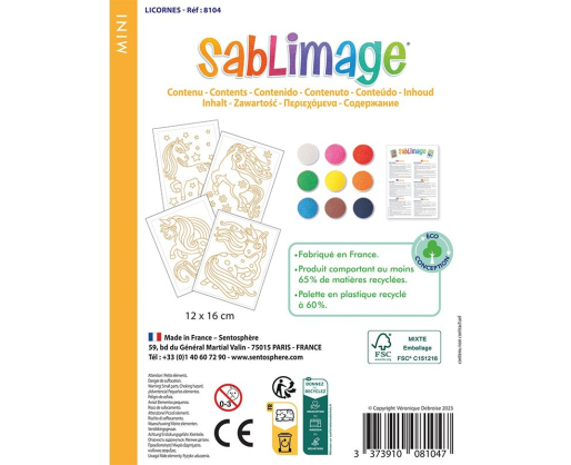 Kūrybinis smėlio rinkinys „Vienaragiai“ sukurtas taip, kad linksmybės tilptų į mažą dėžutę! Džiaukitės „Sablimage“ magija kompaktiškame formate, kurį lengva pasiimti su savimi! Ši smagi rankų darbo veikla skirta tam, kad net patys mažiausi vaikai galėtų lengvai ir nevaržomai kurti gražius, mielus piešinėlius, nesusitepdami. Kiekvienoje dėžutėje rasite: