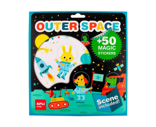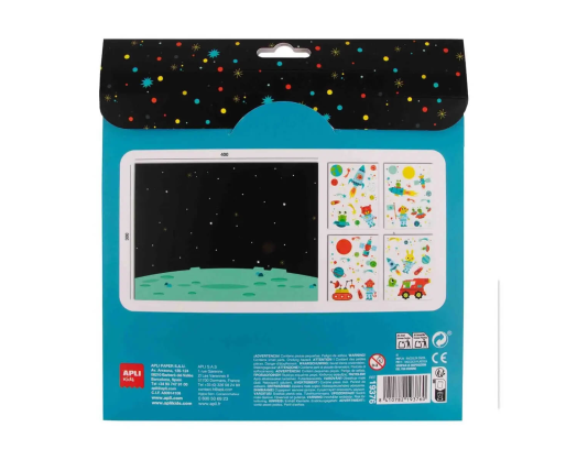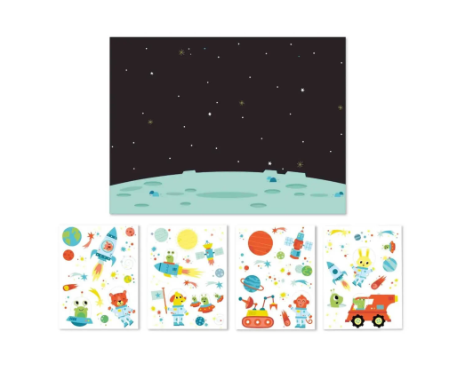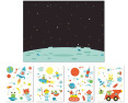 Viduje: 1 dekoravimo plakatas su kosmoso tema 4 nuimami lipdukų lapai su planetomis, raketomis ir astronautais