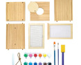 Viduje: 4 medinės plokštės, 2 medinio rėmo plokštės, 12 dažų, klijai, įvairūs teptukai, vadovas (EN).