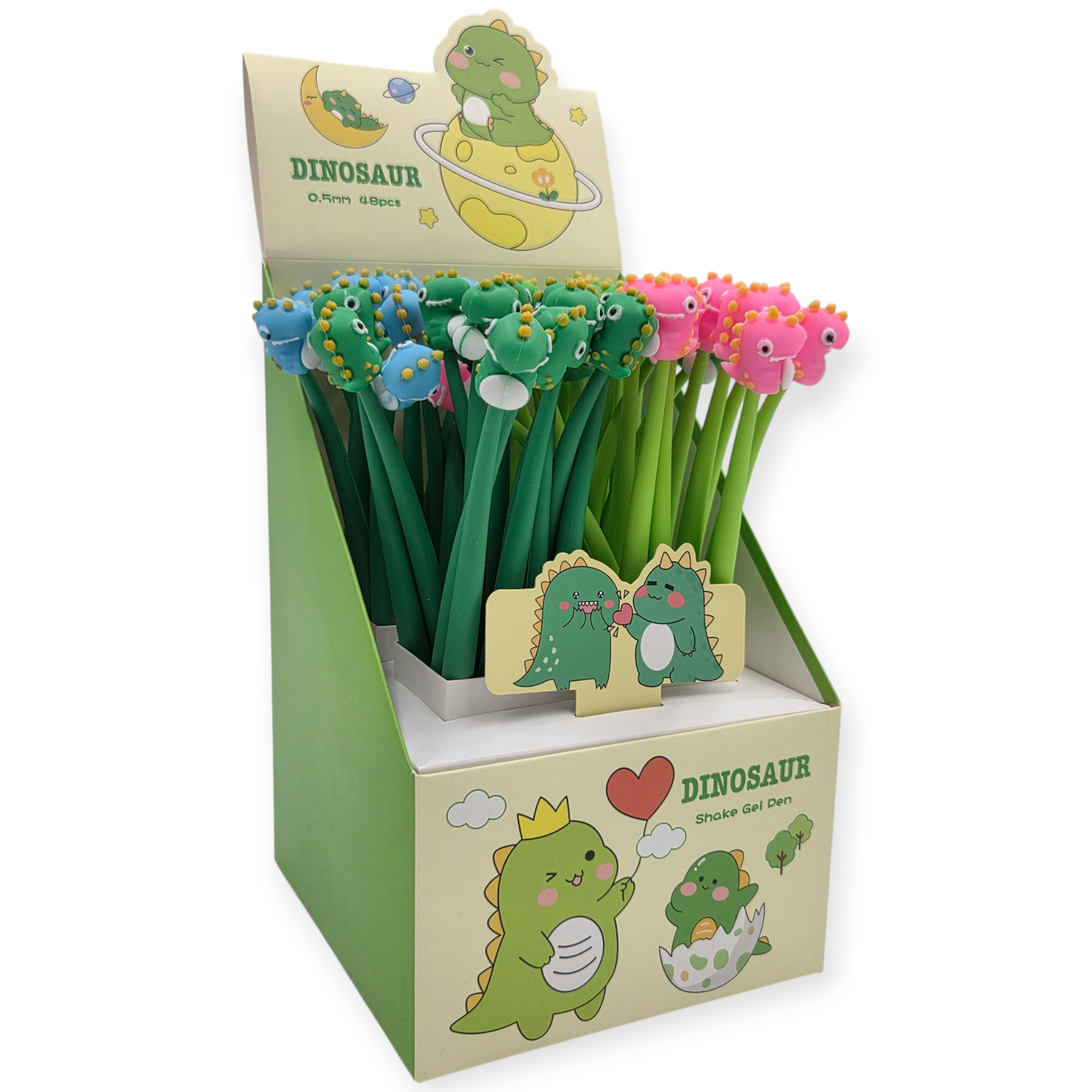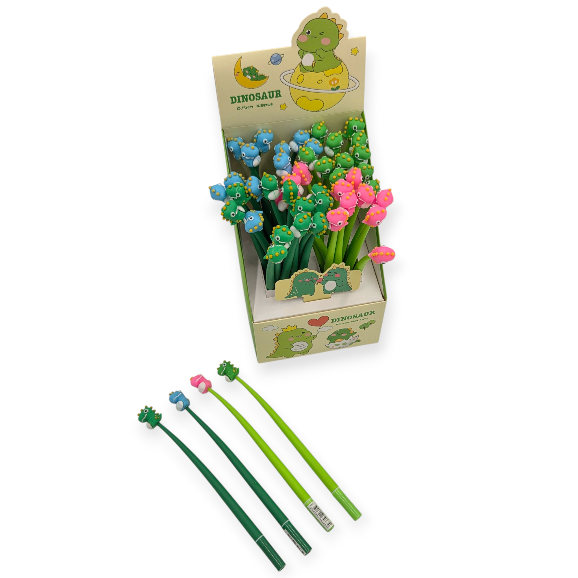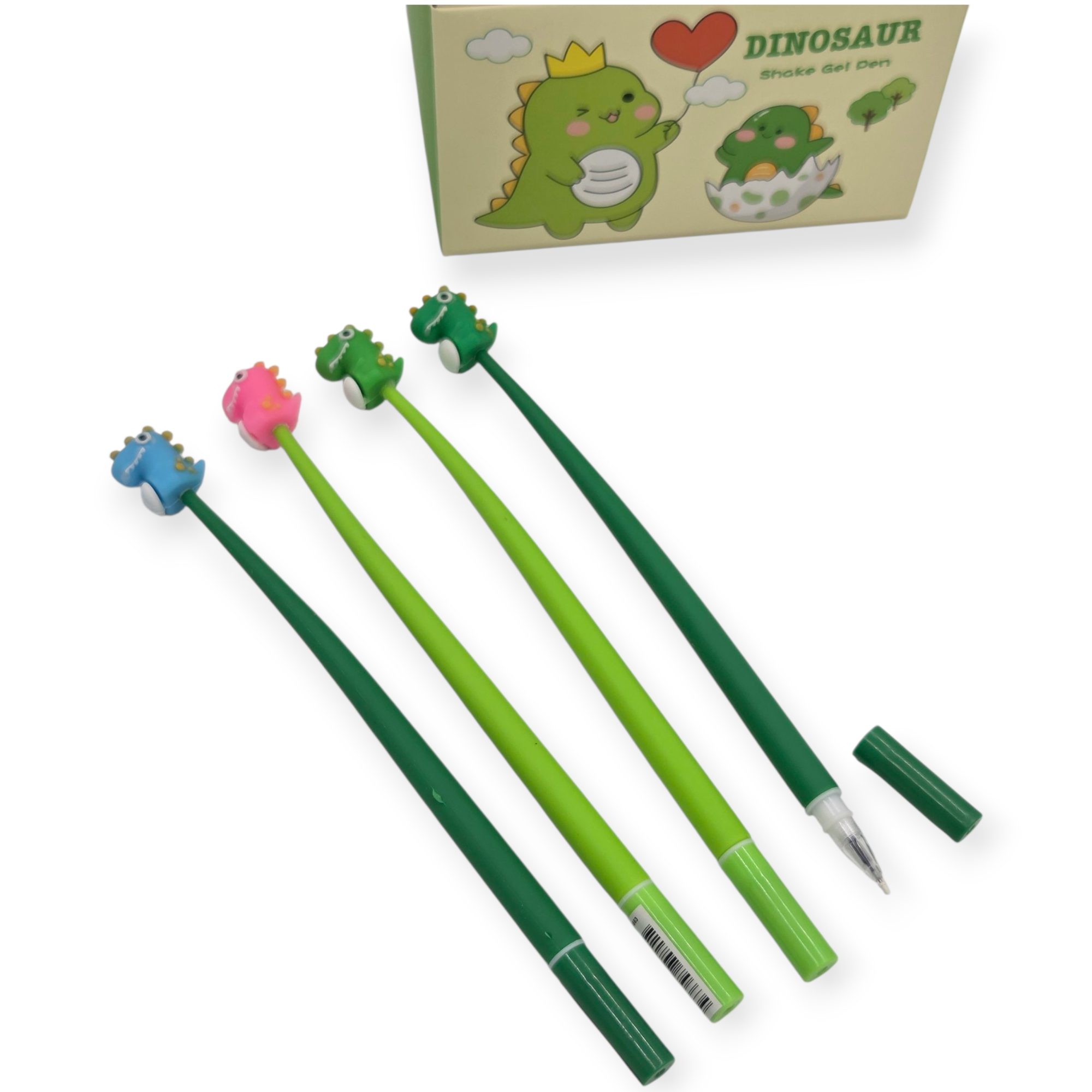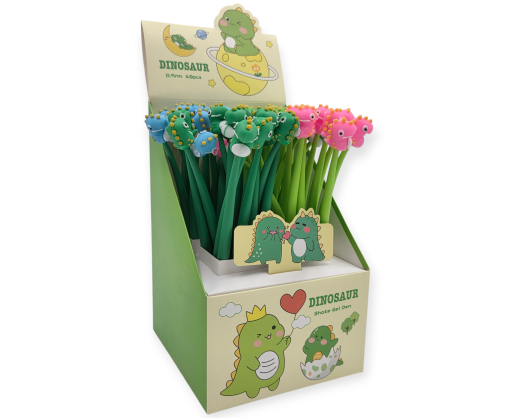 Smagūs geliniai rašikliai su dinozaurų figūrėlėmis viršuje. Puikiai tinka tiek vaikams, tiek suaugusiems, kurie mėgsta žaismingus rašiklius.