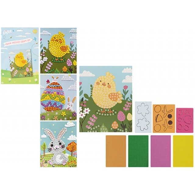 Kūrybinis Velykų rinkinys su putplasčio mozaika – smagi ir paprasta veikla vaikams. Kiekviename rinkinyje rasite spalvingas, lengvai klijuojamas detales ir šventinius paveikslėlių pagrindus.