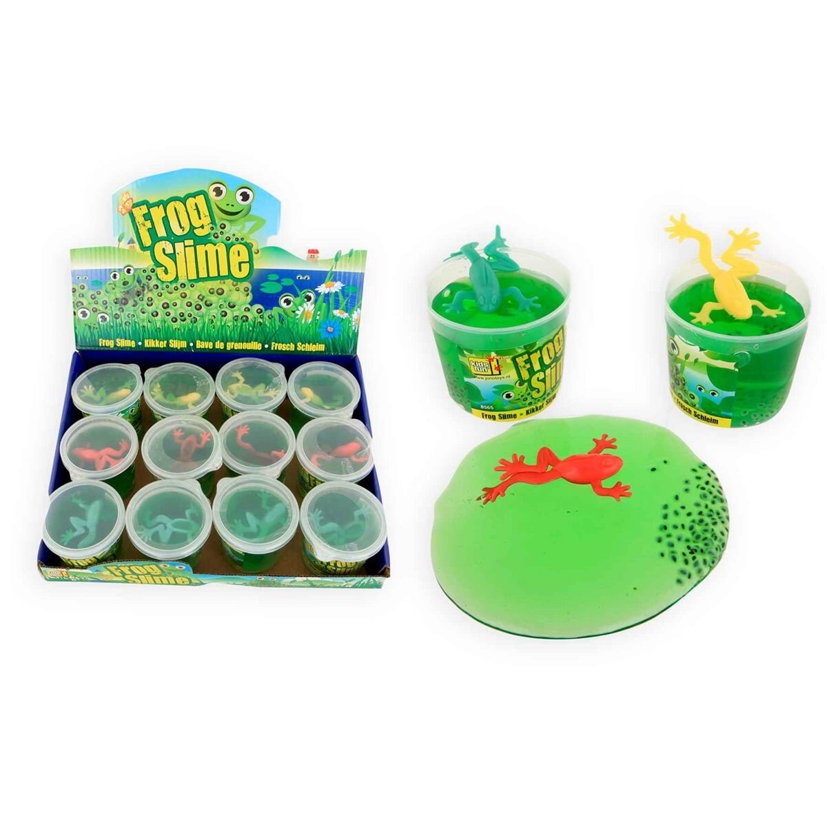 ✅ Ryškios spalvos – žalias slaimas ir įvairių spalvų varlytės.