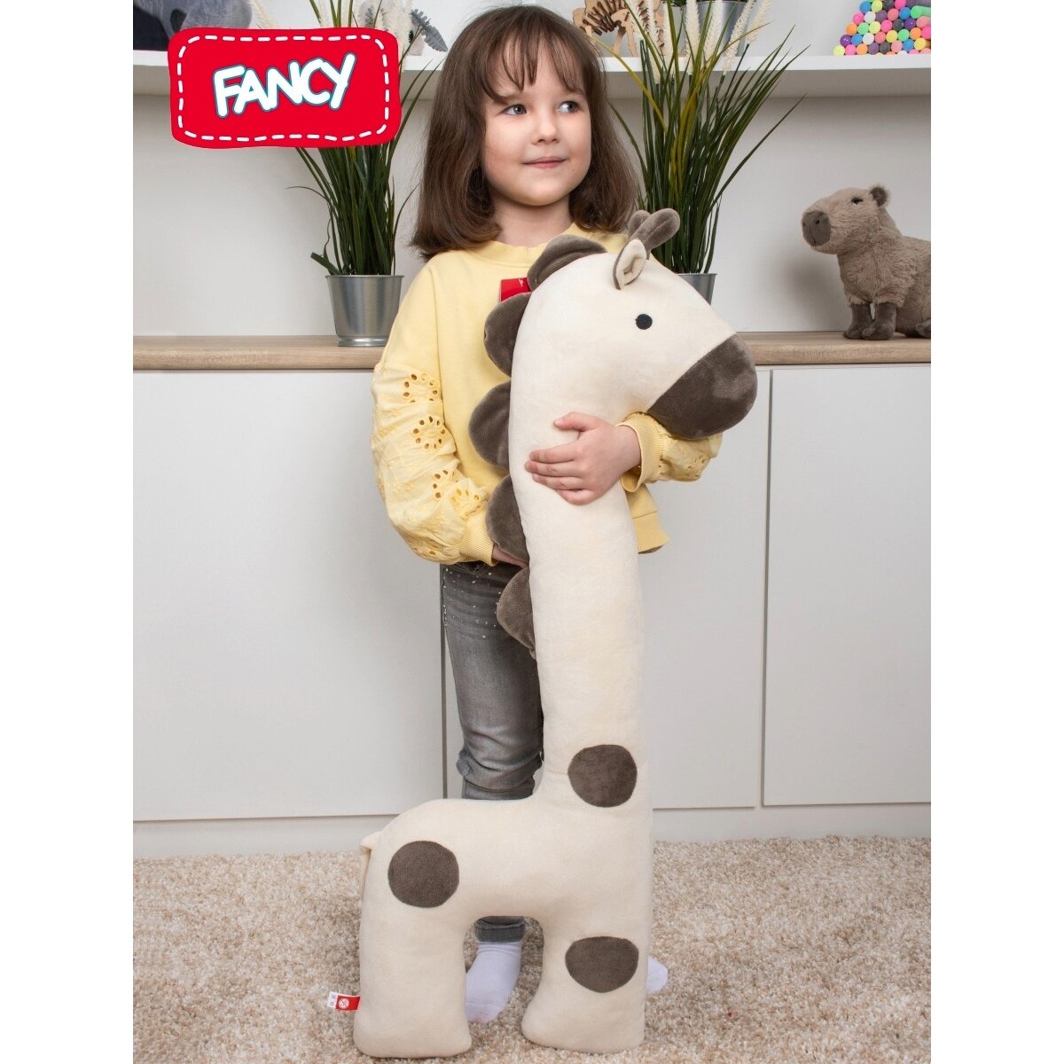 Fancy minkšta žirafa yra puiki, ideali dovana jūsų artimiesiems. Tai mielas, minkštas ir pliušinis žaislas, kurį galima naudoti kaip miego pagalvę. Įdėkite jį į lovelę ir jis sušildys jūsų kūdikį naktį. Jis pagamintas iš aukštos kokybės medžiagų ir turi unikalų dizainą. Dėl tikroviškos išvaizdos jūsų vaikas jį dievins taip, tarsi jis būtų tikras!