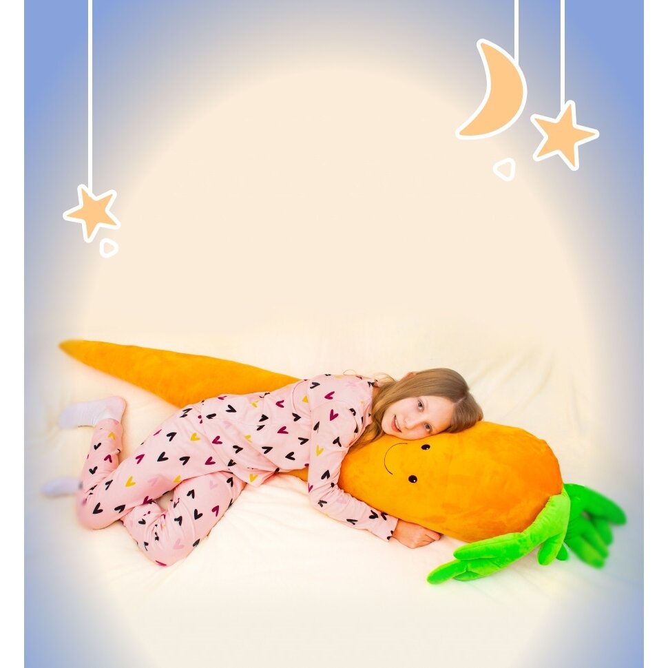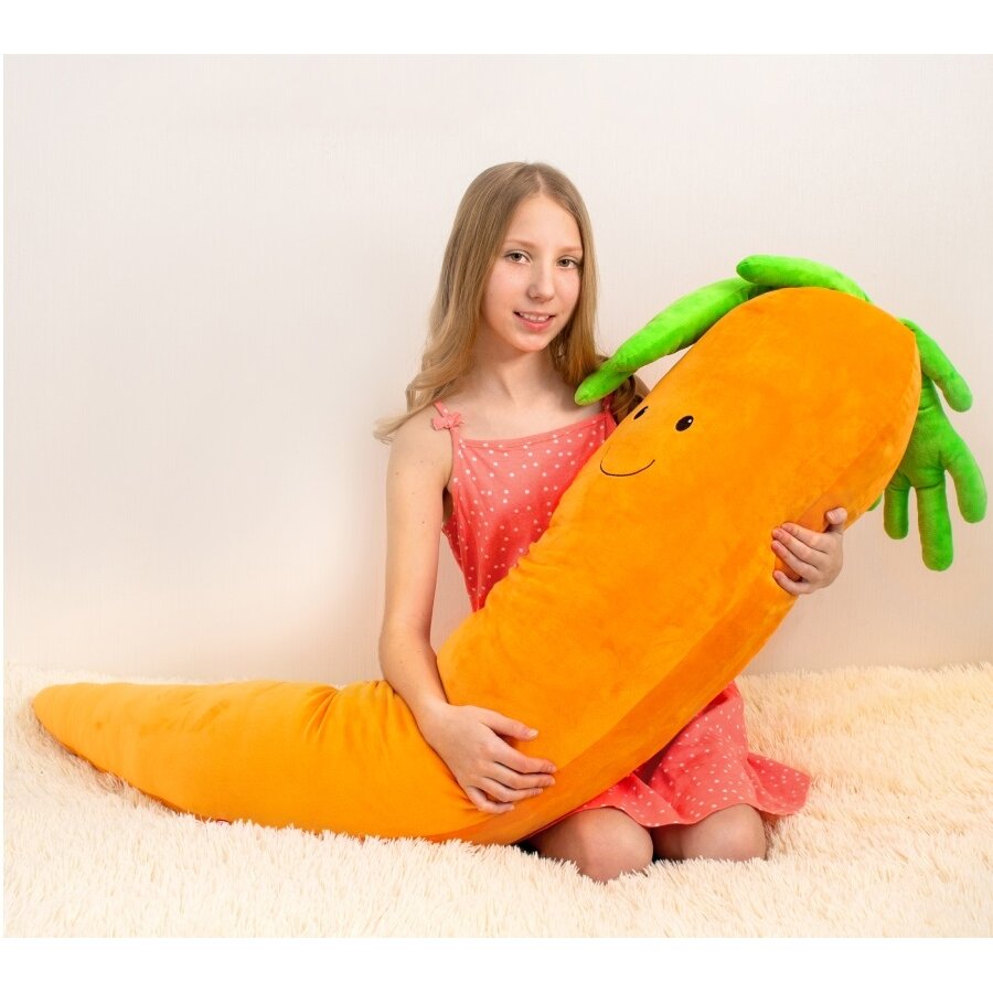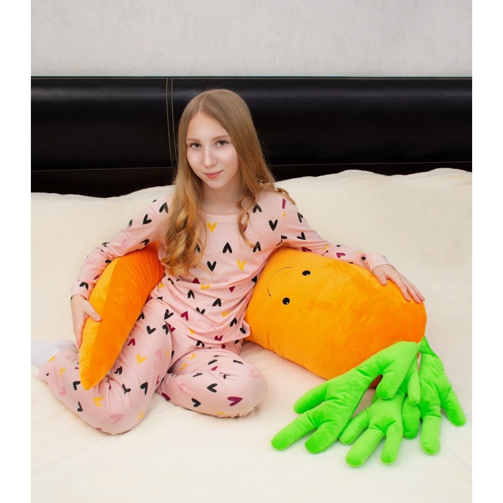 Pagalvės forma neįprasta. Ji atrodo kaip tikra morka. Siuvinėtos akys ir burna. Morką galite naudoti kaip tik patinka. Ji gali papuošti kambarį. Išeina labai gražios ir originalios nuotraukos foto sesijos metu. Morka labai minkšta, medžiaga švelni.