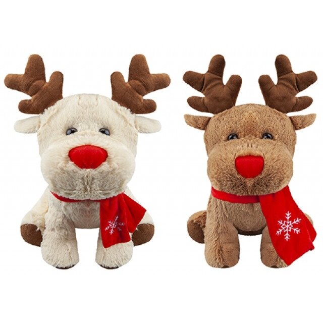 Minkštas ir mielas pliušinis elnias su raudonu šaliku ir raudona nosimi.