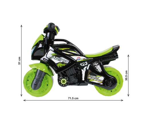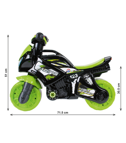 Motociklas pagamintas iš aukštos kokybės patvaraus plastiko, todėl vaikas gali juo važinėti tiek namuose, tiek lauke.