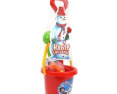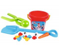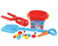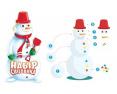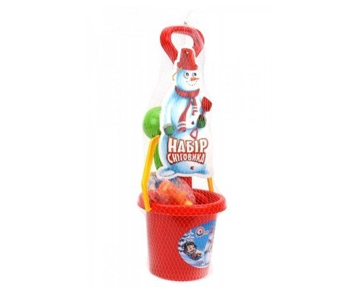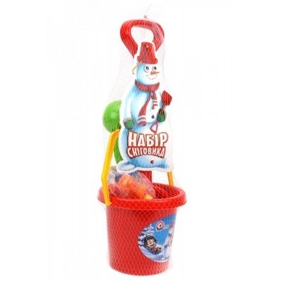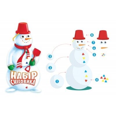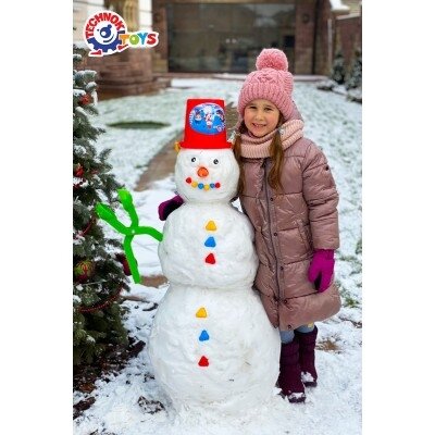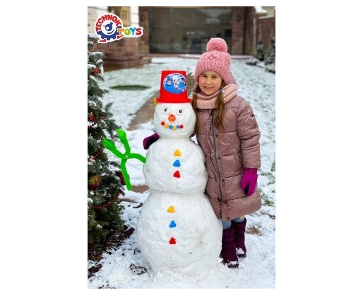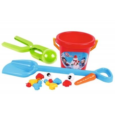 Rinkinyje yra: kastuvas; kibiras; ryški morka; spalvotos sagos; akys; sniego gniūžčių gaminimo replės.