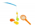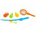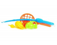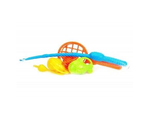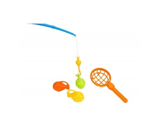 Žvejybos rinkinyje yra meškerė, plūdė, tinklelis, spalvotos žuvys,kurios yra lengvos ir gerai plūduriuoja vandenyje.