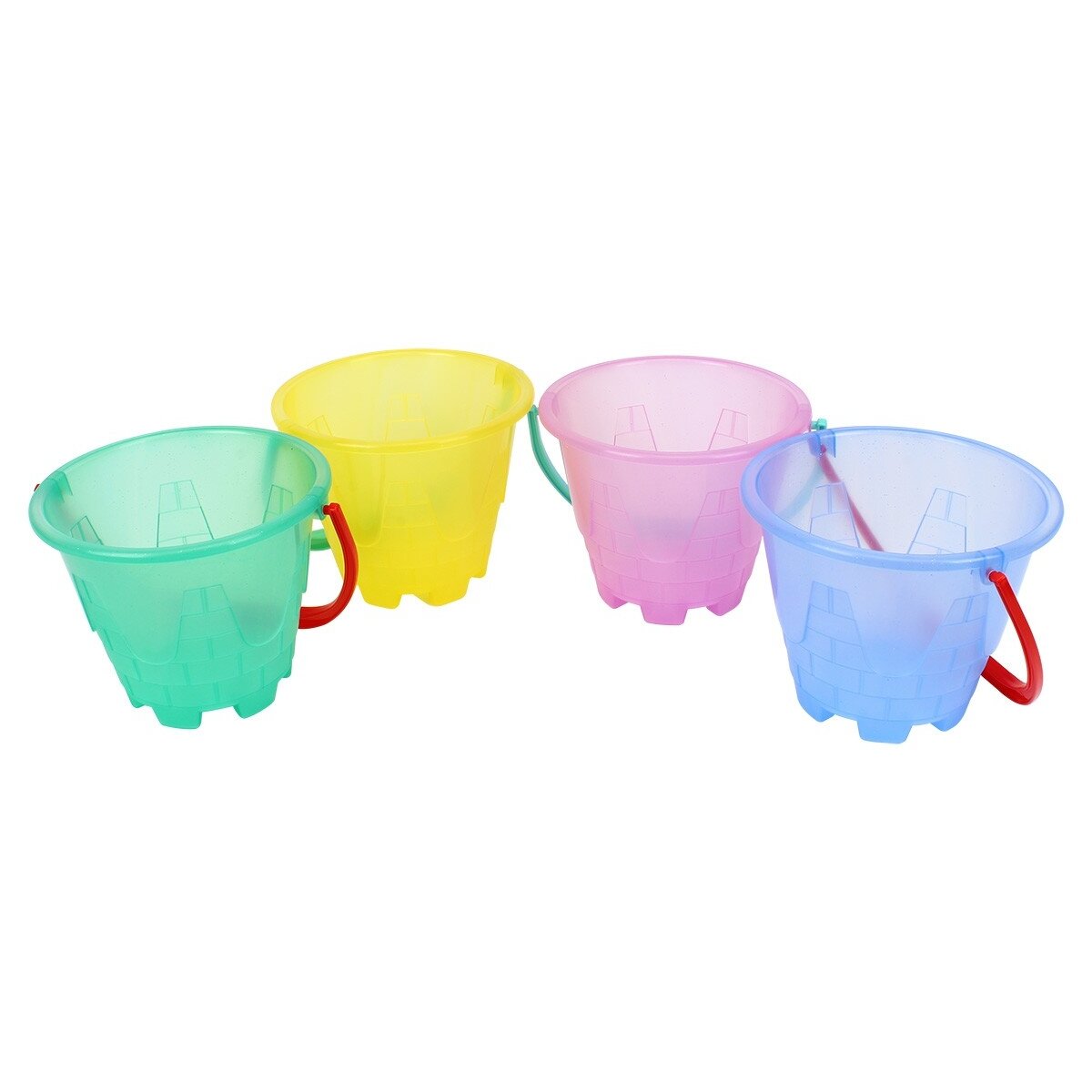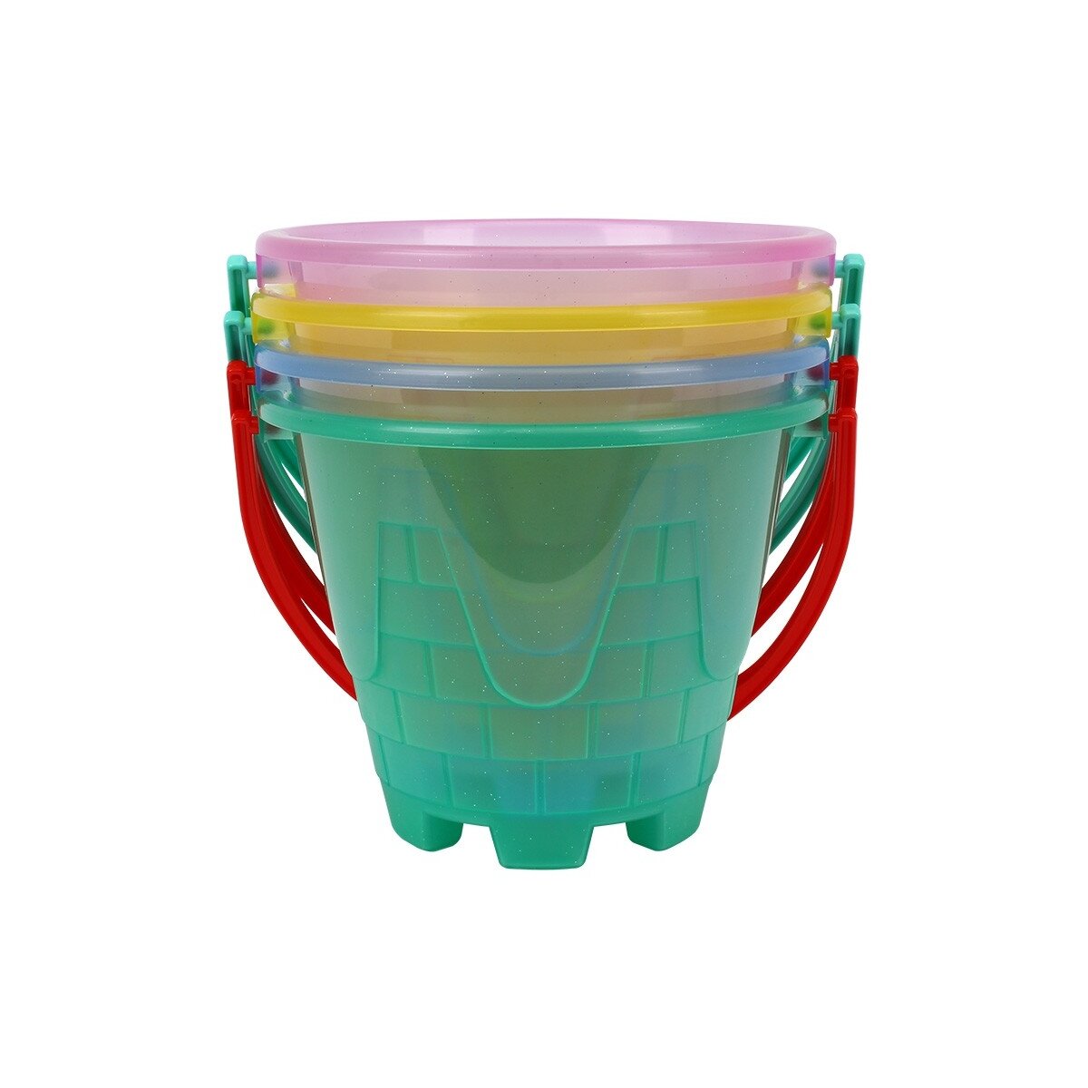 Kibiras įvairių ryškių spalvų: žalias, mėlynas, rožinis, geltonas. Kibirėliai yra permatomi ir su blizgučiais, išskyrus geltoną kibirą. Žaislo spalva parenkama atsitiktinai.