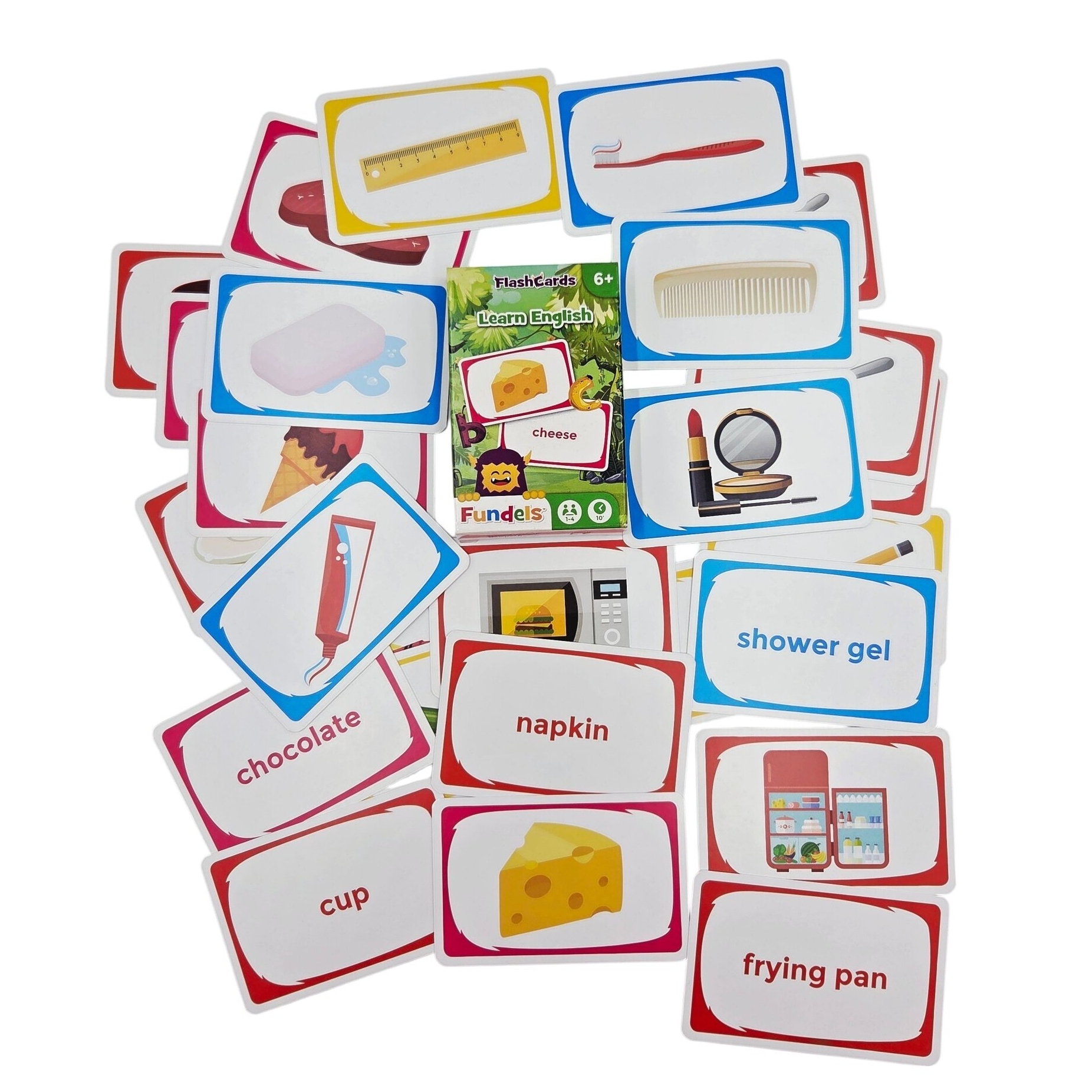 Kiekvienoje kortelėje viena pusė vaizduoja paveikslėlį, o kita – žodžio vertimą, todėl mokymasis tampa vizualiai patrauklus ir įdomus. Galima žaisti įvairius žodyno lavinimo žaidimus – tiek individualiai, tiek su draugais ar šeima.