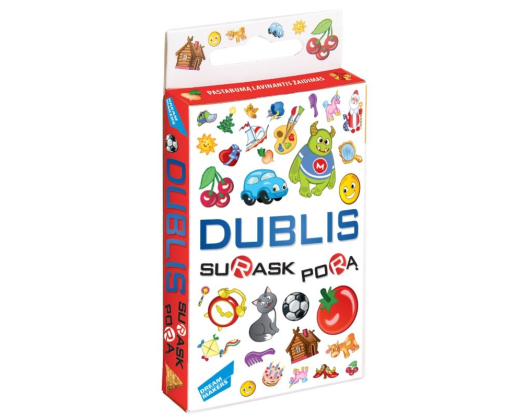 Mini stalo žaidimas DUBLIS - yra linksmas ir aktyvus žaidimas, ugdantis pastabumą ir reakciją. Žaidimo tikslas – pirmam surasti vienodus daiktus, pavaizduotus skirtingose kortelėse. Laimėtoju taps tas, kas pasirodys greičiausias ir pastabiausias ir surinks daugiausia kortelių. Žaidimo tikslas - pirmam surasti tokius pačius paveiksliukus skirtingose kortelėse Žaidėjų skaičius: nuo 2 iki 4.