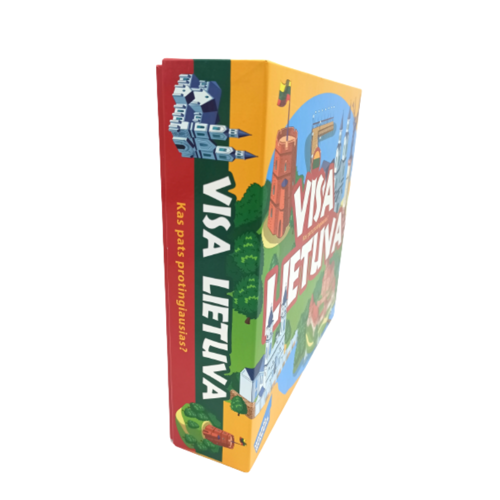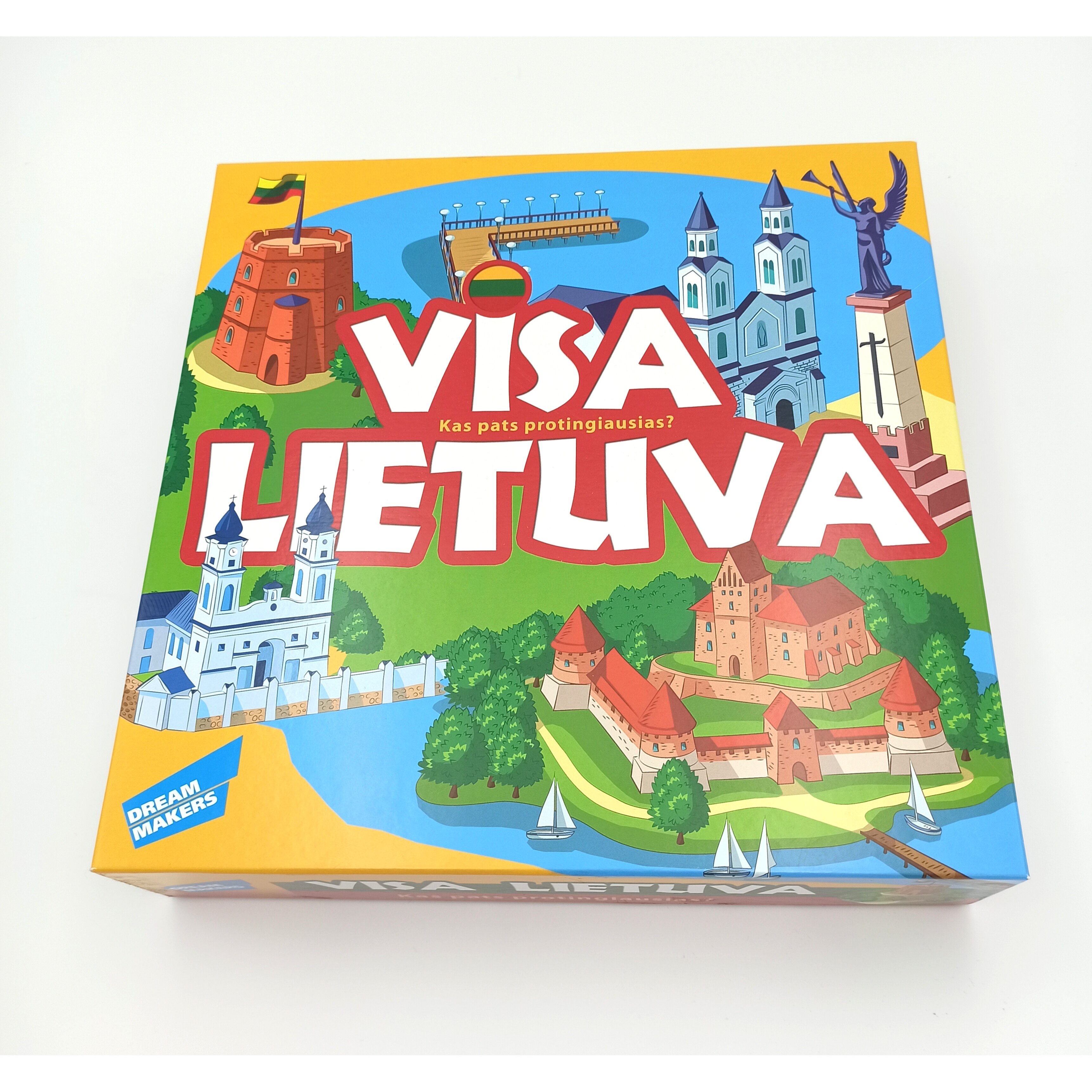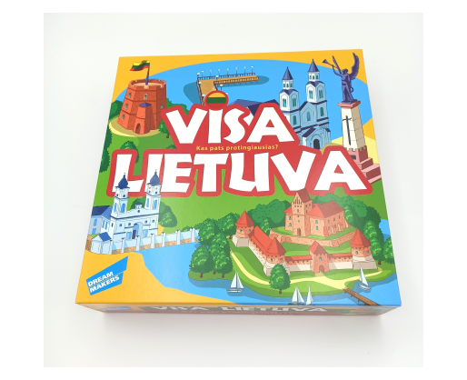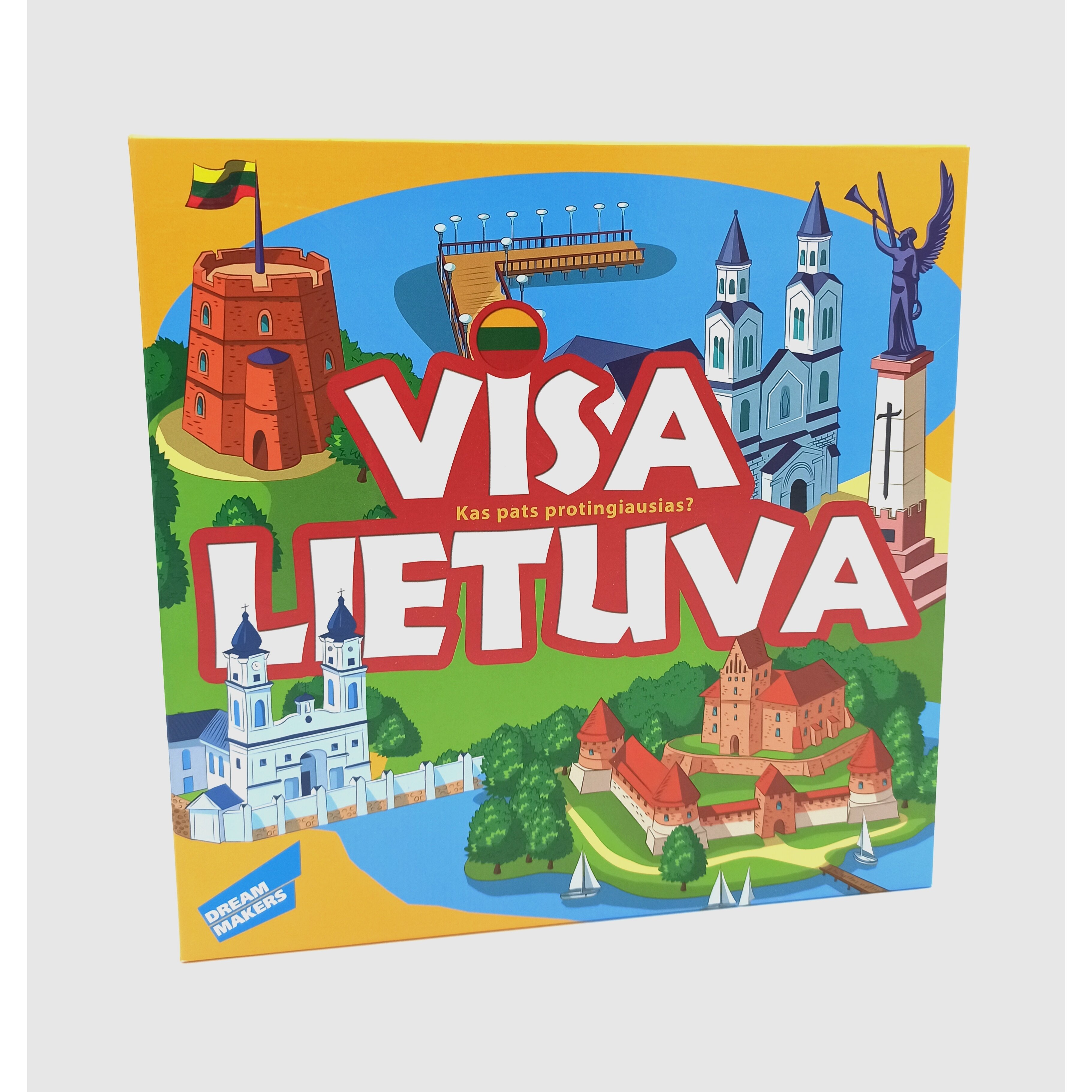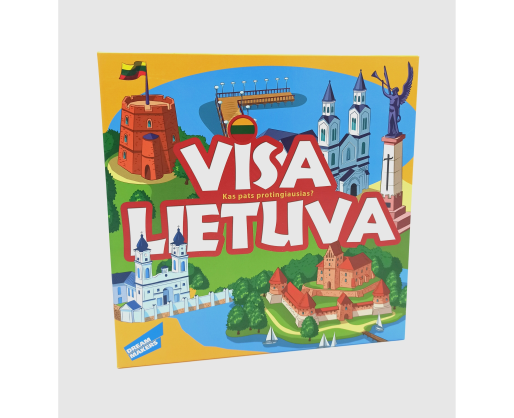 Stalo žaidimas viktorina VISA LIETUVA - žaidimas, kurį žaisdami pasitikrinsite savo žinias, o taip pat sužinosite daug įdomios informacijos apie Lietuvos gyvenimą. VISA LIETUVA žaidimo tikslas - keliaujant po Lietuvos regionus atsakyti į klausimus apie Lietuvos gamtą, kultūrą, lankytinas vietas, geografiją, istoriją. VISA LIETUVA žaidimo žemėlapyje rasite daugiau kaip keturiasdešimt unikalių lankytinų Lietuvos vietų piešinių. Žaidimo rinkinyje yra: žaidimo laukas, 100 klausimų kortelių, 8 žaidimo bokšteliai, žaidimo kubelis, žaidimo taisyklės.