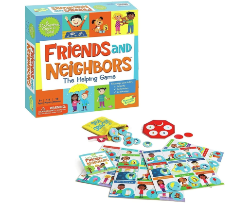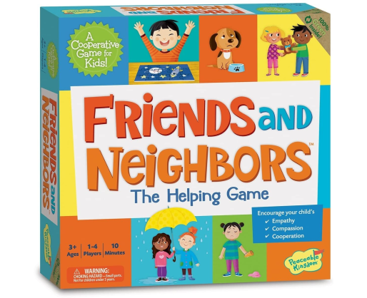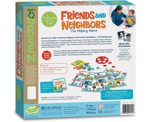 „Friends and Neighbors” yra derinimo ir atitikimo žaidimas, orientuotas į emocijas. Ar žaidėjai sugebės padėti mažai mergaitei, kuri liūdi, nes stovi lauke lietuje, arba berniukui, bijančiam būti tamsoje? Įkiškite ranką į „Pagalbos” maišelį ir ištraukite žetoną - ar jis gali padėti kam nors ant žaidimo lentos? Jei taip - turite porą! Žaisdami žaidimą ir skaitydami apie personažų jausmus ir poreikius, tėvai gali padėti savo vaikams atpažinti jausmus kituose ir taip padėti žengti pirmą žingsnelį empatijos link.Viduje: 4 žaidimo lentos, 14 žetonų, 1 „pagalbos” maišelis, 1 stop ženklo lentelė, socialinio ir emocinio intelekto gidas tėvams bei istorijų knyga.