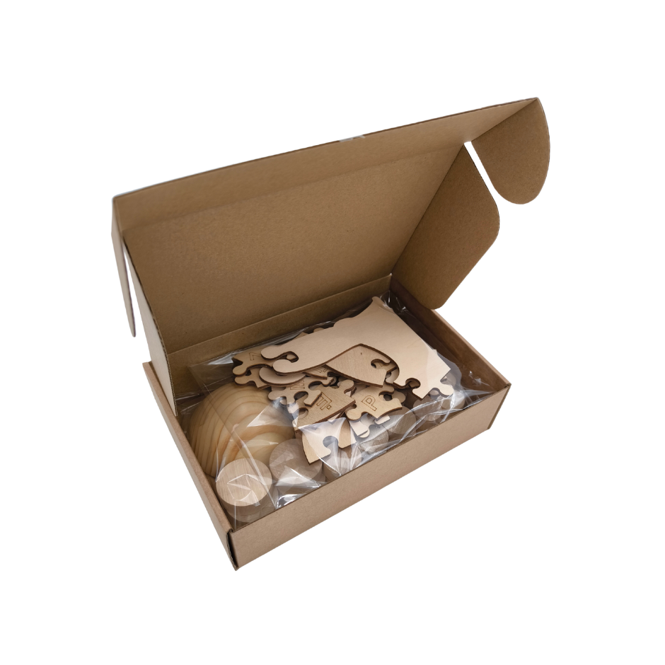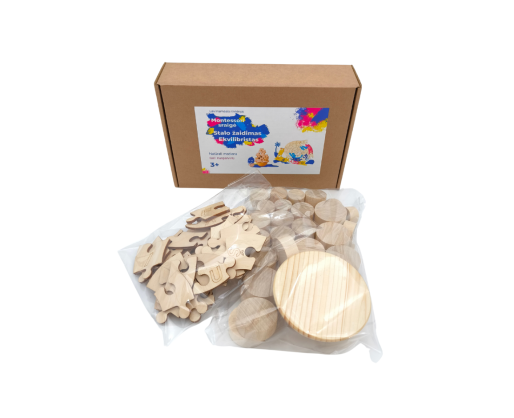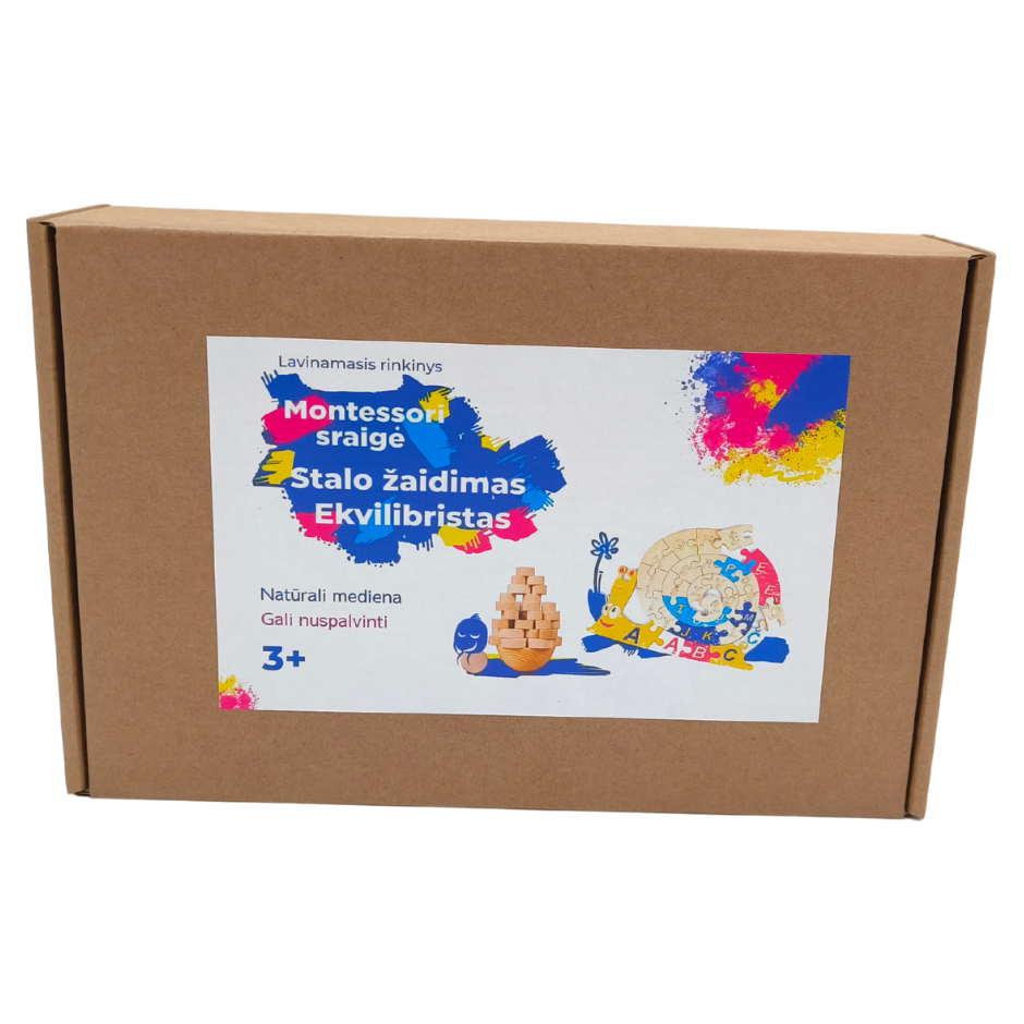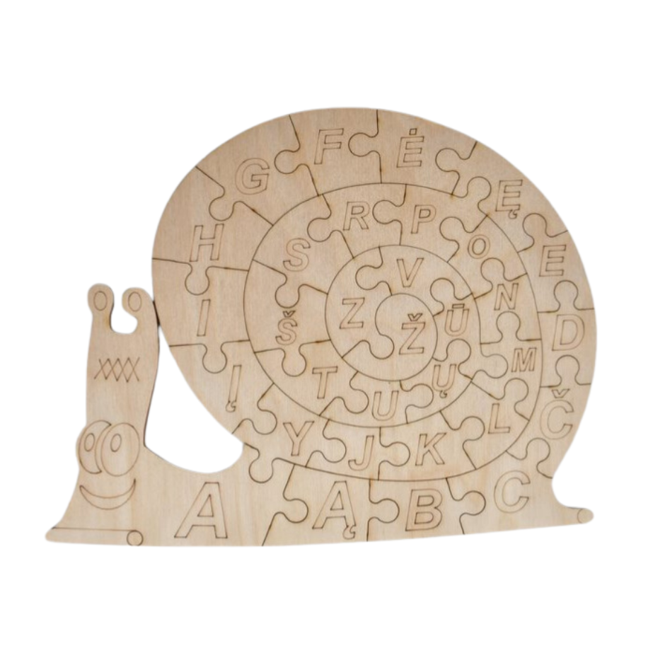 1. Medinė dėlionė pagal M. Montessori, italų gydytojos ir pedagogės, ugdymo metodiką. Vaiko užduotis yra savarankiškai surinkti dėlionę. Teisingai atlikęs užduotį, vaikas palaipsniui mokysis raidžių ir lietuviškos abėcėlės. Sudėliotą sraigę galima nuspalvinti pieštukais, dažais arba flomasteriais.