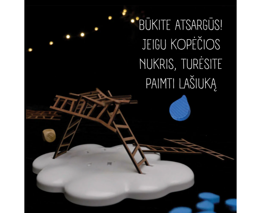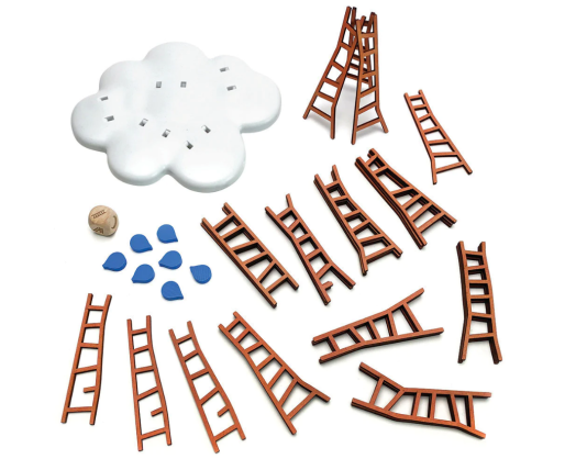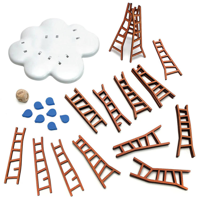 Viduje: Žaidimo pagrindas (debesies formos), 30 medinių kopėčių, 7 medinių lašų, 1 didelis medinis kauliukas, 1 taisyklių knygelė (EN kalba).