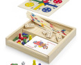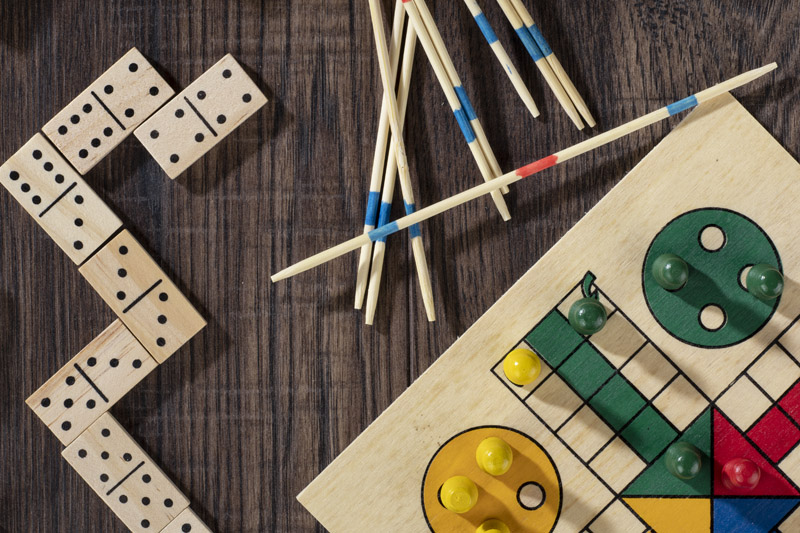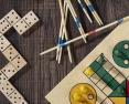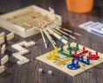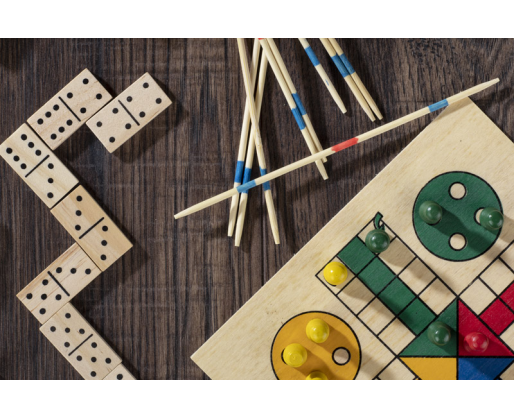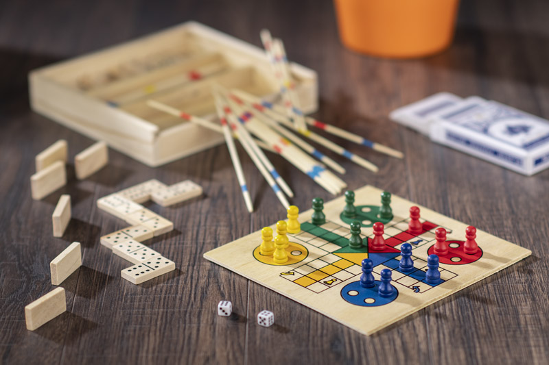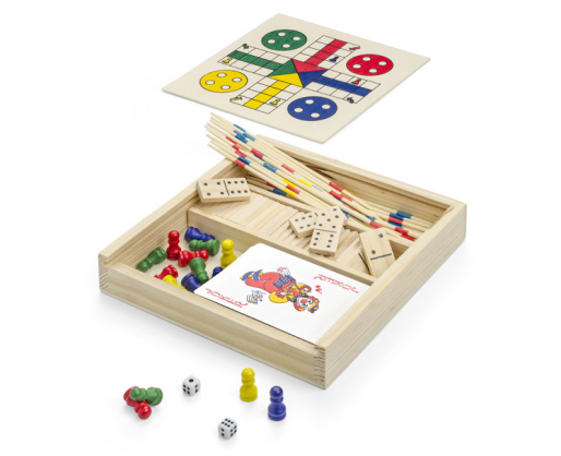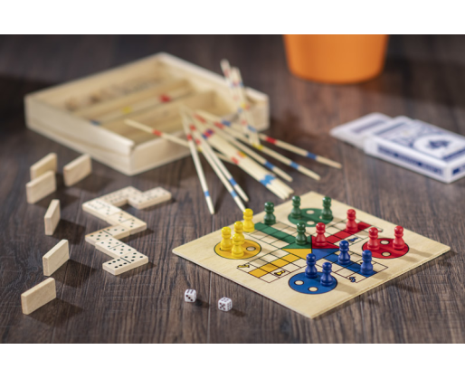 Žaidimų rinkinys praktiškoje medinėje dėžutėje. Yra keturi skirtingi žaidimai: domino, mikado, ludo ir kortų kaladė.