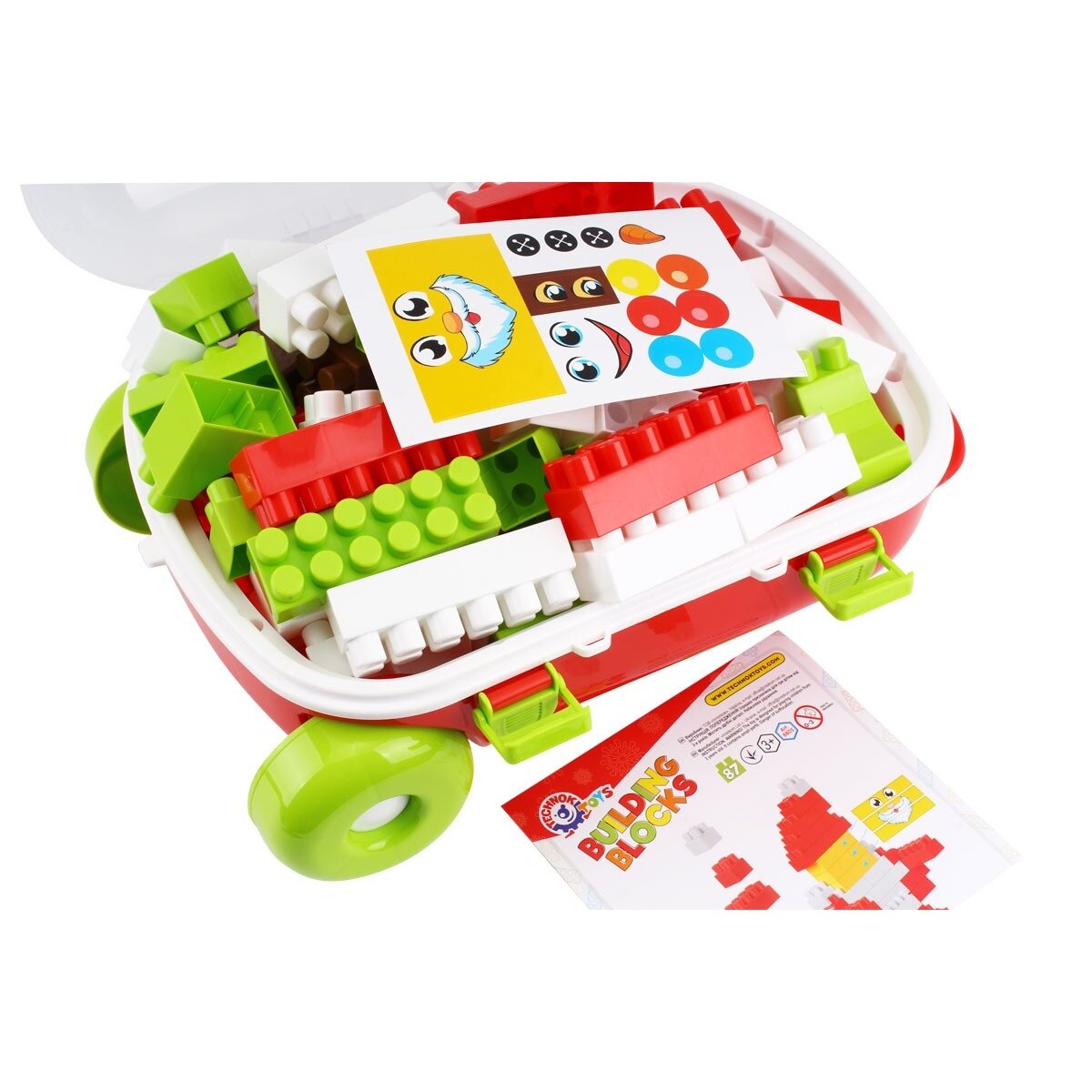 Komplekte: lagaminas su permatomu dangčiu, 87 konstrukciniai elementai, lipdukų rinkinys, instrukcijos.