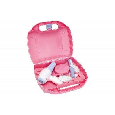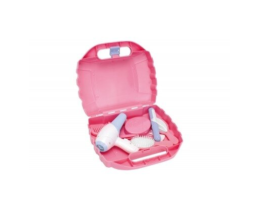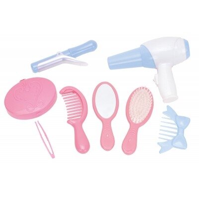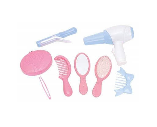 Rinkinyje yra viskas, ko reikia kasdienei grožio priežiūrai: šukos, šepetys ir lankelis madingai šukuosenai. Jei norite garbanotos šukuosenos, tuomet garbanojimo geležis iš komplekto puikiai tiks. Veidrodis su rankena, aukštų dažnių garsiakalbiai ir pudros dėžutė padės atlikti idealų makiažą. Taip pat jums reikės plaukų džiovintuvo, kad gerai išdžiovintumėte plaukus ir padarytumėte minkštą šukuoseną. Dabar maža madinga mergaitė turės viską kaip jos mamytė.