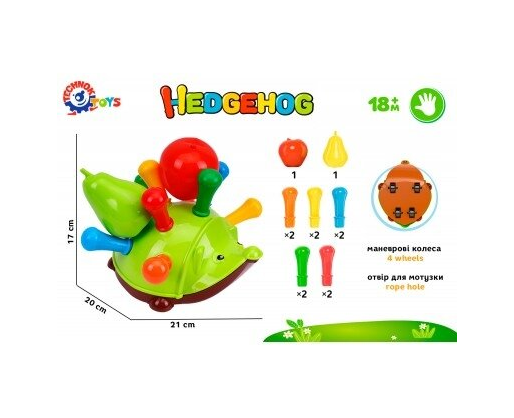 Naujovė rūšiuoklis ežys TechoK atitinka visus kokybiško ir naudingo žaislo reikalavimus. Rinkinį sudaro ryškus ežiukas, 10 spalvotų adatų, obuolys ir kriaušė. Visi elementai gali būti naudojami juokingiems žaidimams ir lavinimo pratimams.